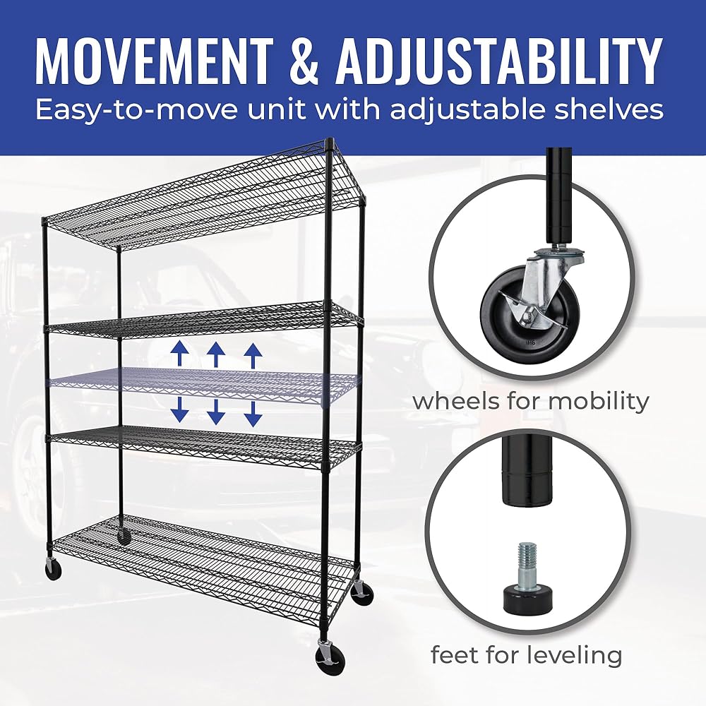 LARGE STORAGE RACK SHELF: Being 60" wide by 24" deep by 72" high and having 4 levels of metal shelves, our storage shelves give you ample storage space.