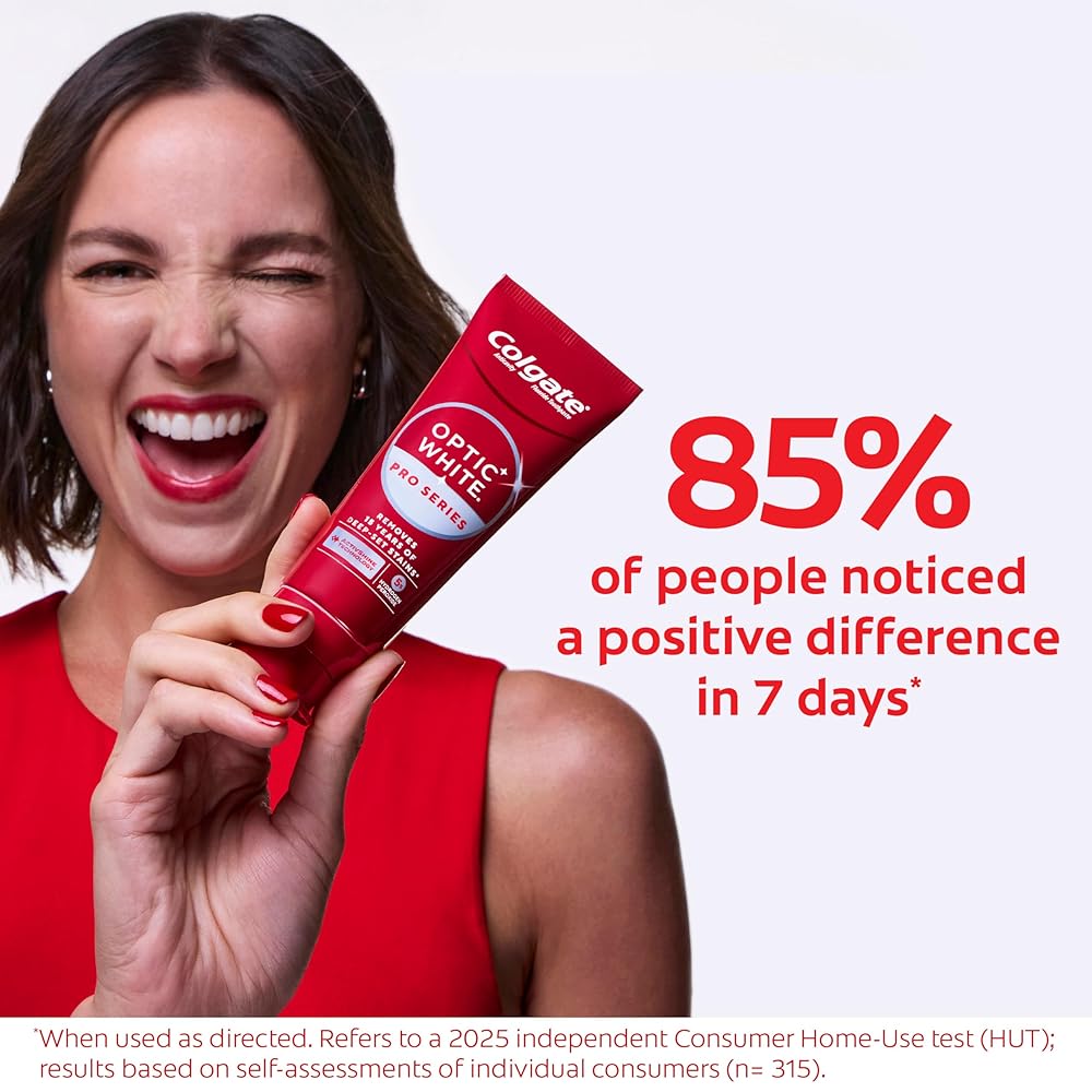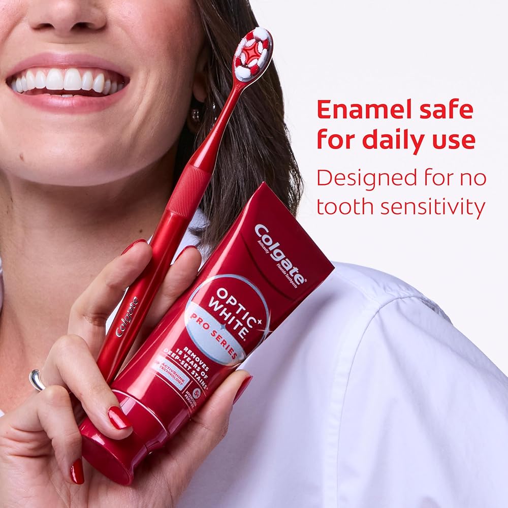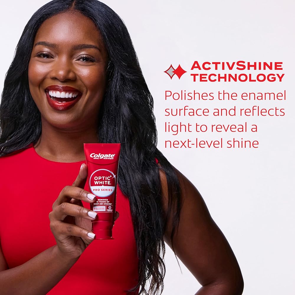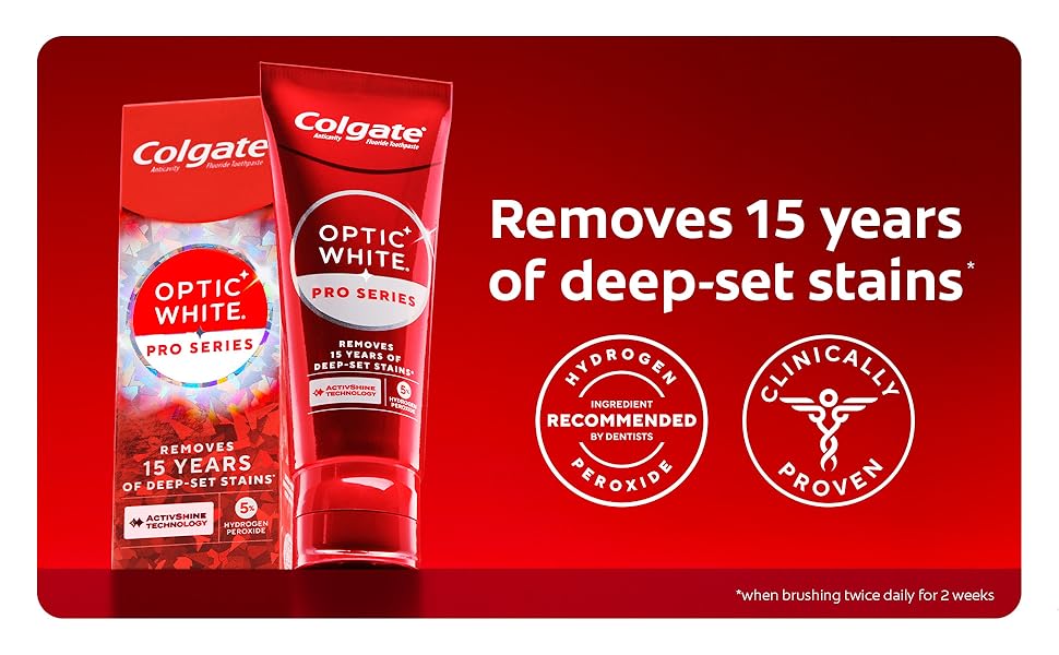 Powered by HP Complex, our unique formulation of Hydrogen Peroxide, Optic White Pro Series gives you 5X whiter teeth than the leading whitening toothpaste after 1 day*. This clinically proven formula contains Hydrogen Peroxide, the same whitening ingredient used by dentists. Plus, innovative ActivShine Technology polishes the enamel surface to reveal next-level shine. Achieve visibly whiter teeth in 3 days** as the dual-action teeth whitening formula brushes surface stains away while dissolving tough stains below the surface. After two weeks, this 5% hydrogen peroxide toothpaste removes 15 years of deep-set stains**. Plus, ActiveShine Technology polishes enamel for a bright, glowing smile. Optic White Pro Series toothpaste dissolves deep-set stains without causing tooth sensitivity or compromising enamel health. With this invigorating mint toothpaste, there's no need to choose between having a bright smile and safeguarding your enamel. *vs. Crest 3D White Advanced silica-based toothpaste. Use as directed. **when brushing twice daily for 2 weeks