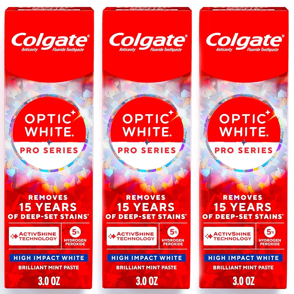 Colgate Optic White Pro Series High Impact White, 3 Pack, Teeth Whitening Toothpaste with 5% Hydrogen Peroxide and ActivShine, Brilliant Mint Flavor, 3.0 OZ