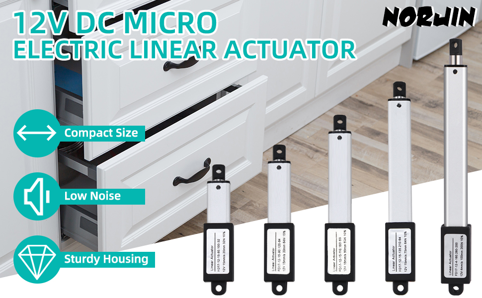 NORJIN 12V Mini Electric Linear Actuator 1.2 inch Stroke, Speed 0.6inch/s, 60N/14lb, Waterproof Linear Motion Actuator w/Mounting Brackets for Cabinet, Window Opener, Robot Projects