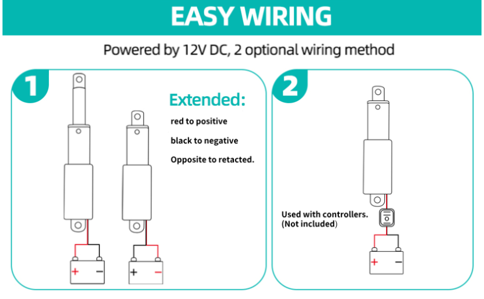 【Easy to Install】The electric linear actuator comes with mounting brackets, making it very easy to install. Connect the positive and negative terminals correctly and apply voltage, the linear actuator will extend; reverse the polarity and it will retract.