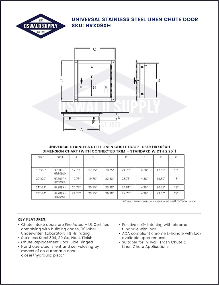 Oswald Supply Stainless Steel Linen Chute - Left Hinged, 20"(W) X20(H), T-Handle