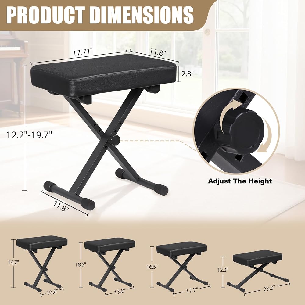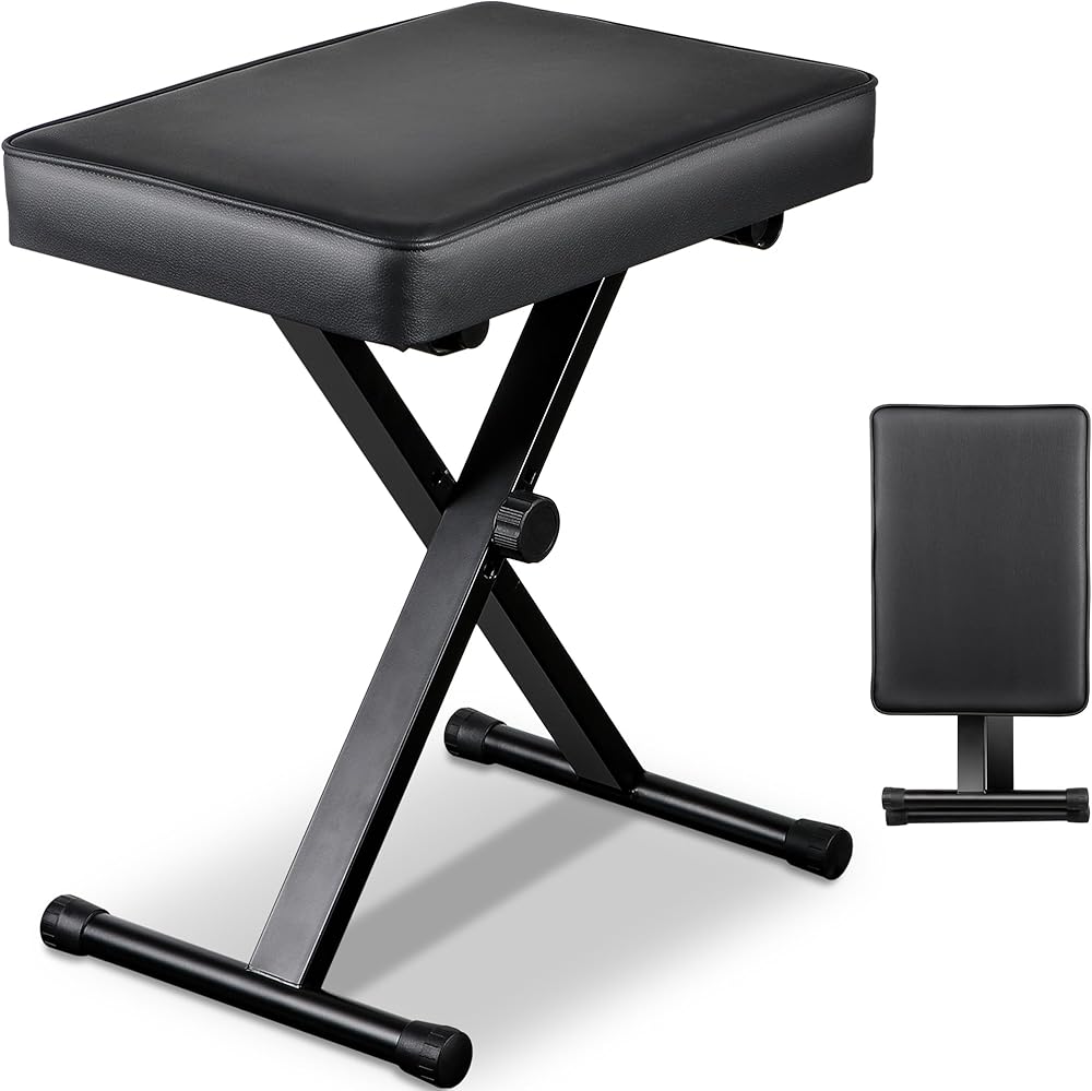 Whether you're just starting out or have been playing for years, it's essential to have a proper bench when playing piano or keyboard. It features a wide, ultra-soft padded top, and sturdy steel construction. It has soft rubber foot pads so it won't scratch delicate floors. This is the perfect way to stay comfortable and balanced while you play.