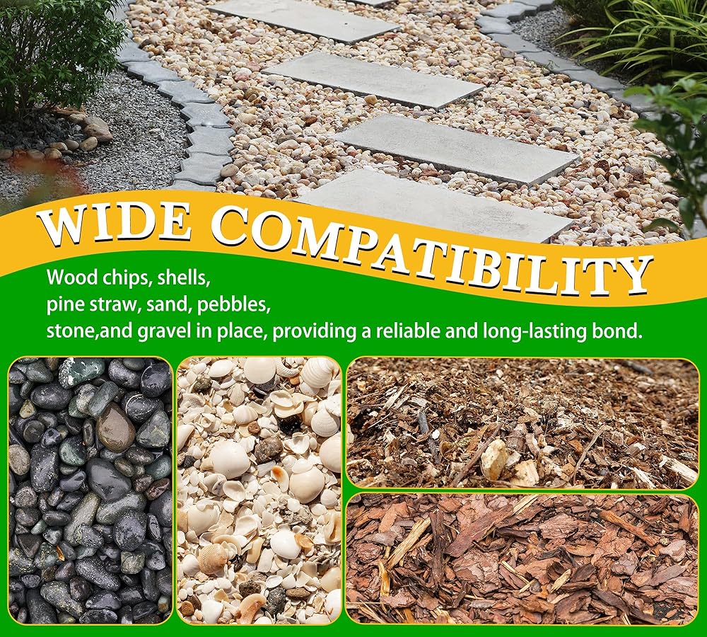 Unparalleled Adhesion - Wave goodbye to messy yards with our professional-grade rock glue. This weather-resistant gravel binder permanently bonds loose pea gravel, stones, pebbles, rubber mulch, pine straw, wood chips, hay, shells and more—eliminating constant cleanup after every storm.