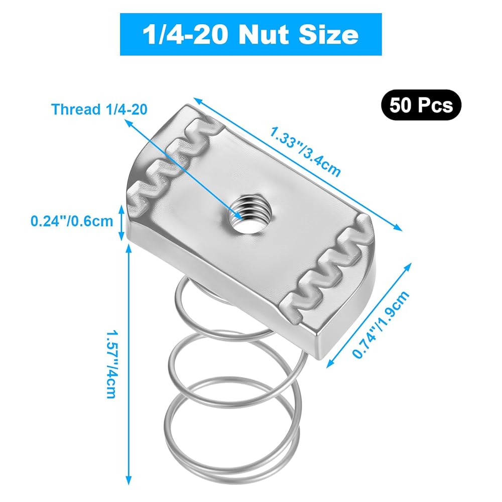 50 Pcs Strut Channel Nuts 1/4"-20 Spring Thickened Unistrut Hardware with Zinc Plated Without Spring Slot Rack Nuts Use On Channel Struts to Locate Mounts Solar Panel, Aluminum Superstrut