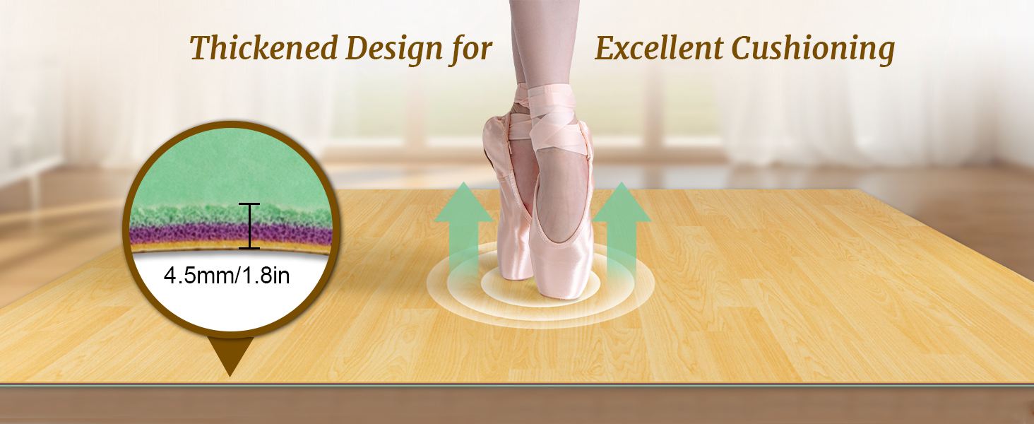 0.18INCHE THICKNESS:With a thickness of 0.18 inches/4.5mm, the ballet dance floor provides sufficient cushioning to support jumps and movements, helping reduce impact and improve comfort during practice