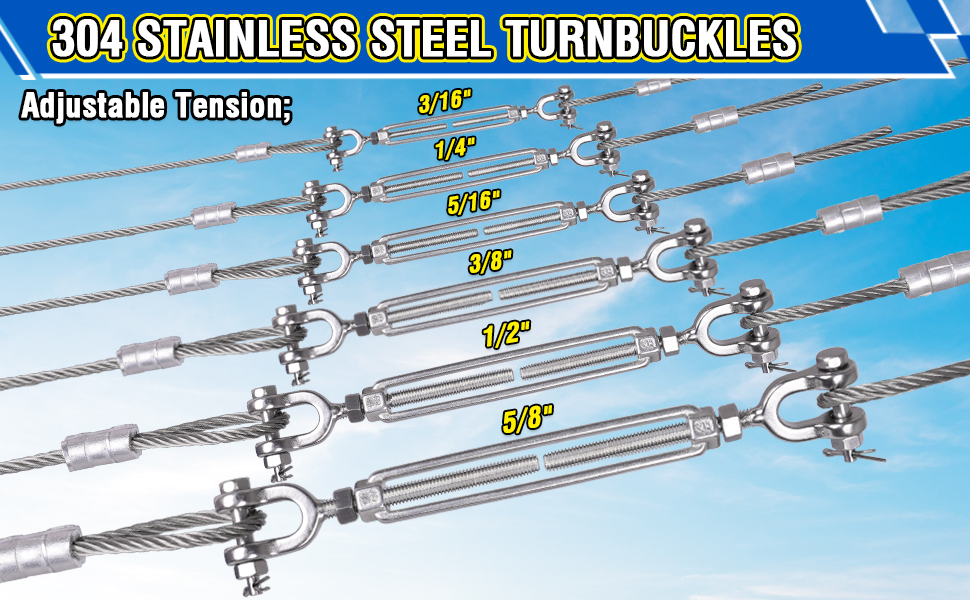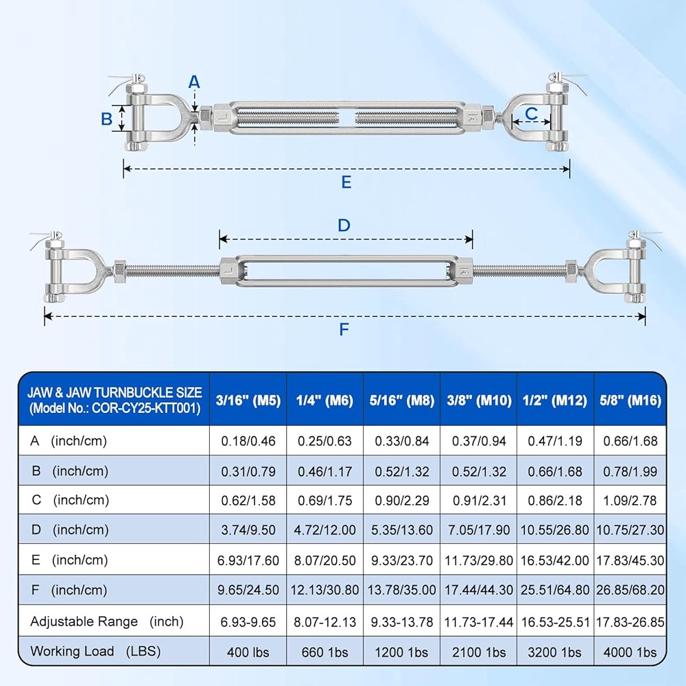 Package Includes & Optional Size: 1pcs 3/16" Turnbuckles. CORDUN turnbuckle has different sizes to choose from, which are 3/16"(M5), 1/4"(M6), 5/16"(M8), 3/8"(M10), 1/2"(M12), 5/8"(M16), each model is different in size and load capacity, you can choose the right model according to your needs. Please Note: Turnbuckles must always be inspected for wear, distortion, cracks and damage before use; Loading must be applied in a straight line and not angular