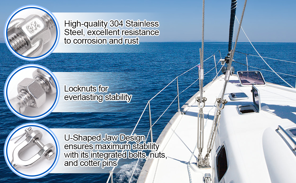 Premium Material: Our CORDUN turnbuckles are crafted from 304 Stainless Steel for a smooth surface, excellent resistance to corrosion and rust, regardless of the weather. Excellent toughness and impact resistance ensures a long service life.