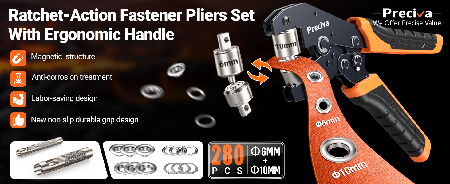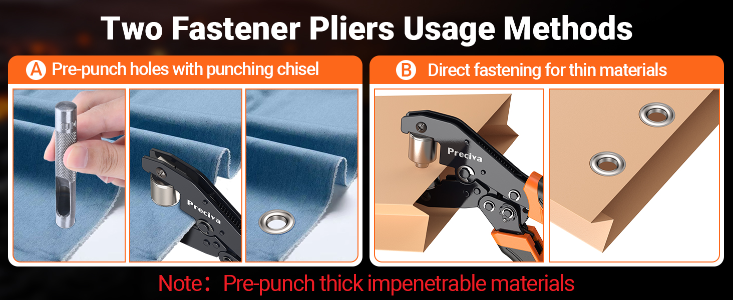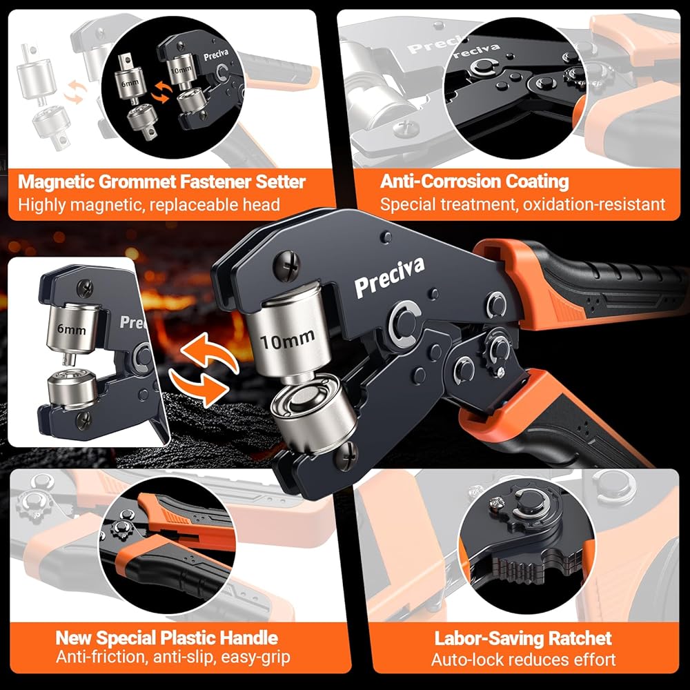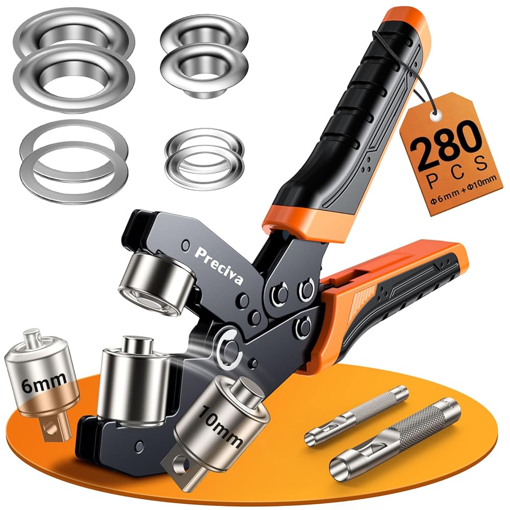 【Interchangeable Double-Head Design】Our Preciva grommet tool kit features a versatile design with two interchangeable head sizes (3/8" and 1/4"). This handheld grommet tool allows for easy switching between sizes, ensuring you can tackle various projects efficiently.