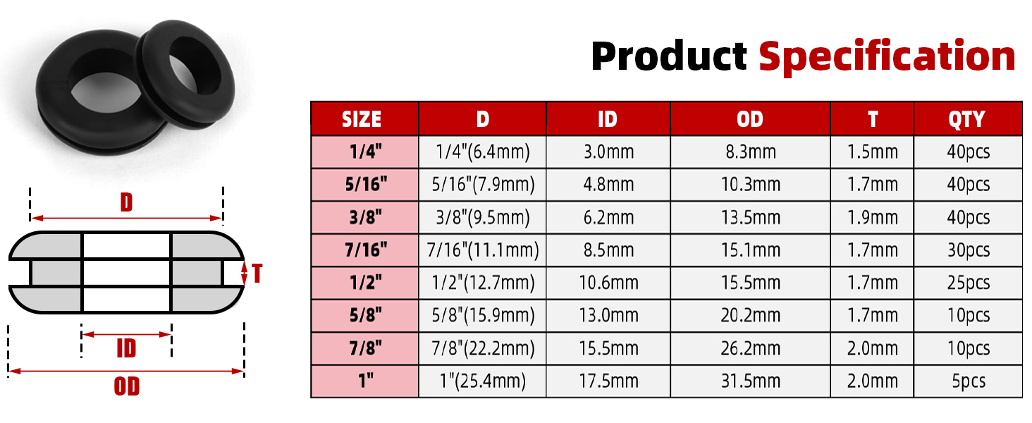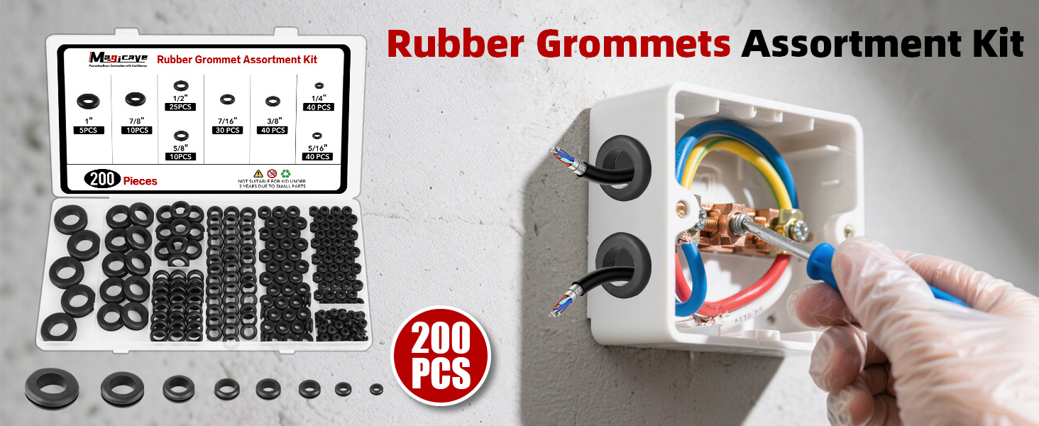 Package Includes – This assortment kit includes 200 rubber grommets in 8 commonly used sizes: 1/4" (40 pcs), 5/16" (40 pcs), 3/8" (40 pcs), 7/16" (30 pcs), 1/2" (25 pcs), 5/8" (10 pcs), 7/8" (10 pcs), and 1" (5 pcs)—ideal for daily use and a wide range of repair tasks