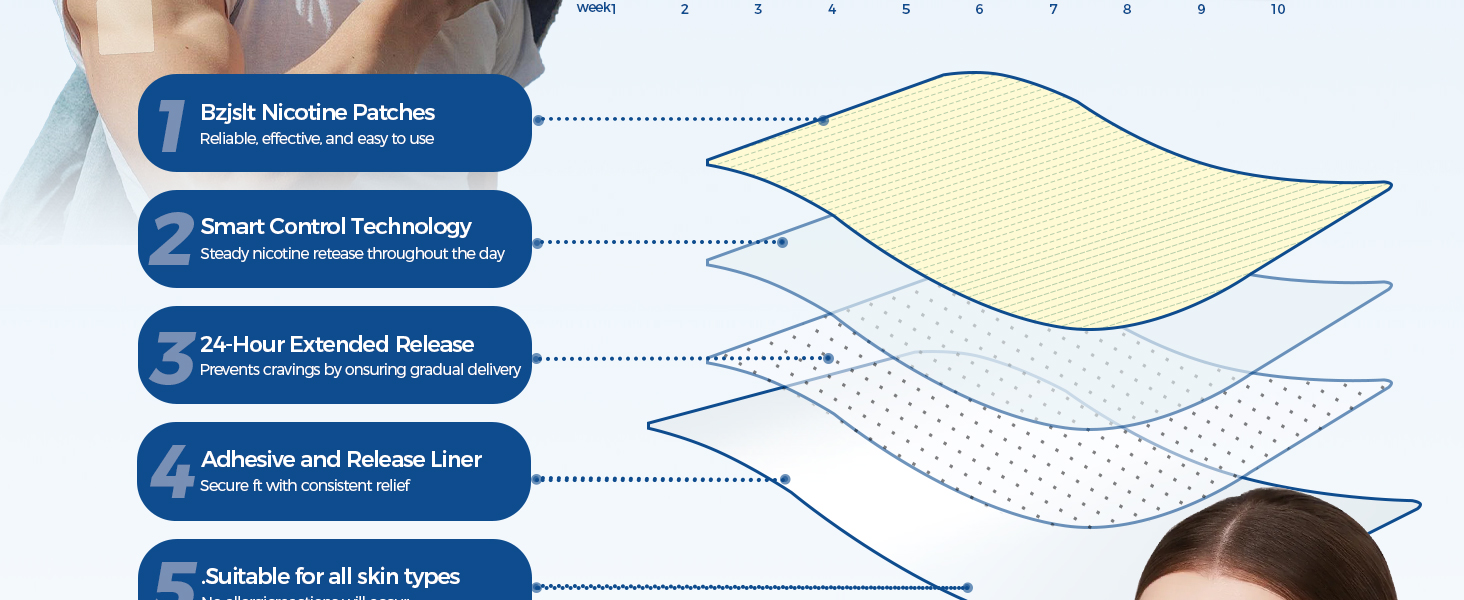 【Core Mechanism 】hese patches utilize a multi-layer matrix system designed for sustained transdermal delivery of pharmaceutical-grade nicotine. The active ingredient permeates the stratum corneum, achieving steady-state plasma concentration