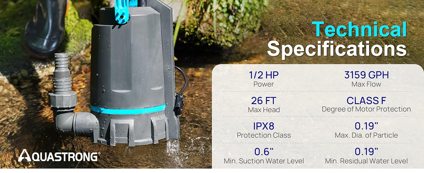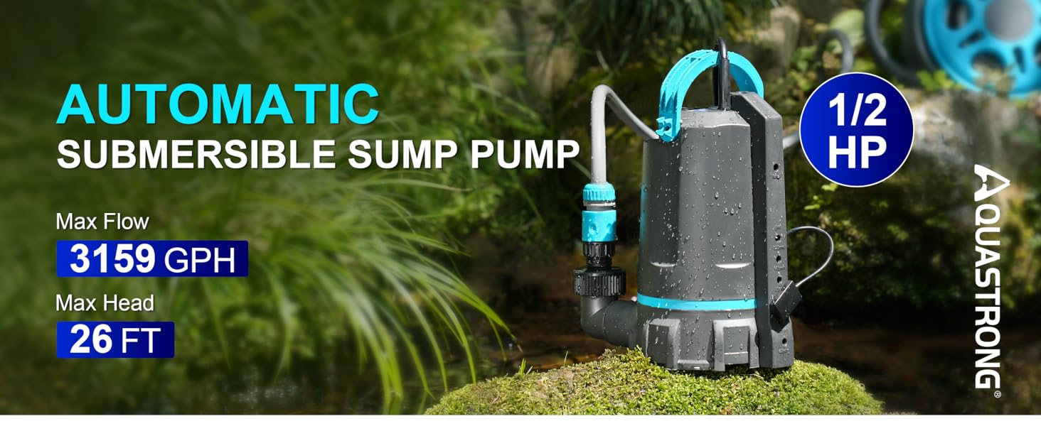 Powerful Sump Pump: Aquastrong sump pump with 1/2 HP powerful motor. Draining water up to 3159GPH Per Hour( 52 gallons per minute) at 5ft. Lift water up to 26ft of vertical height
