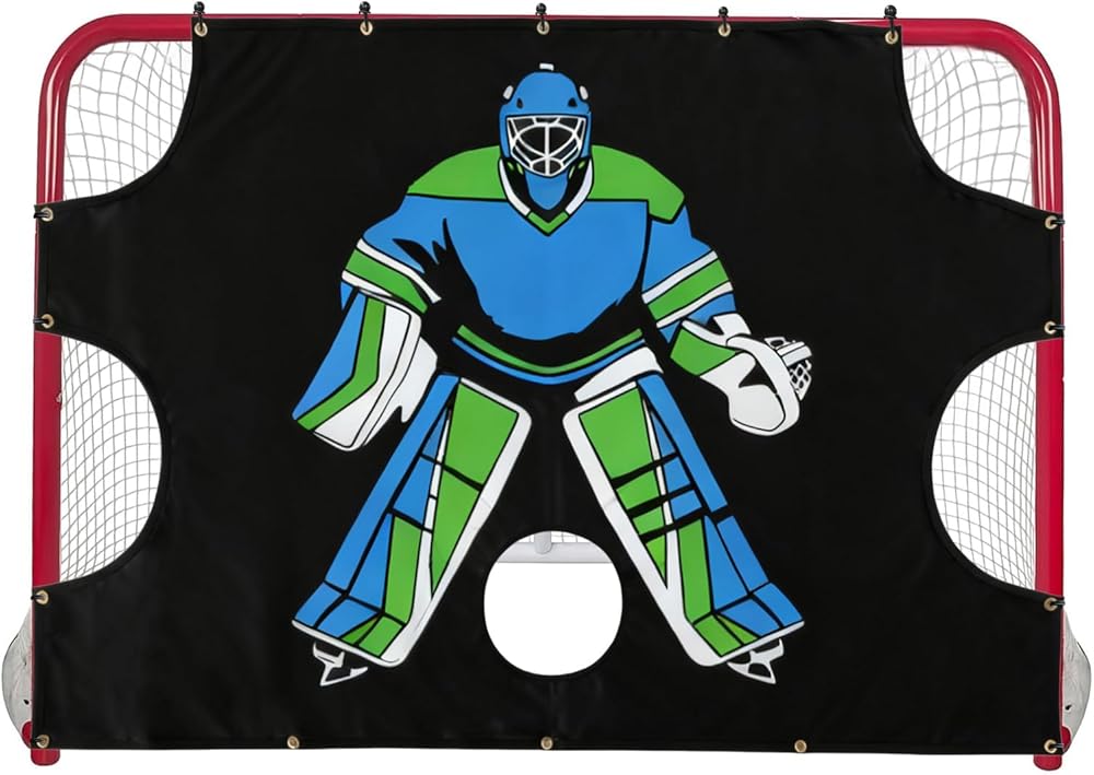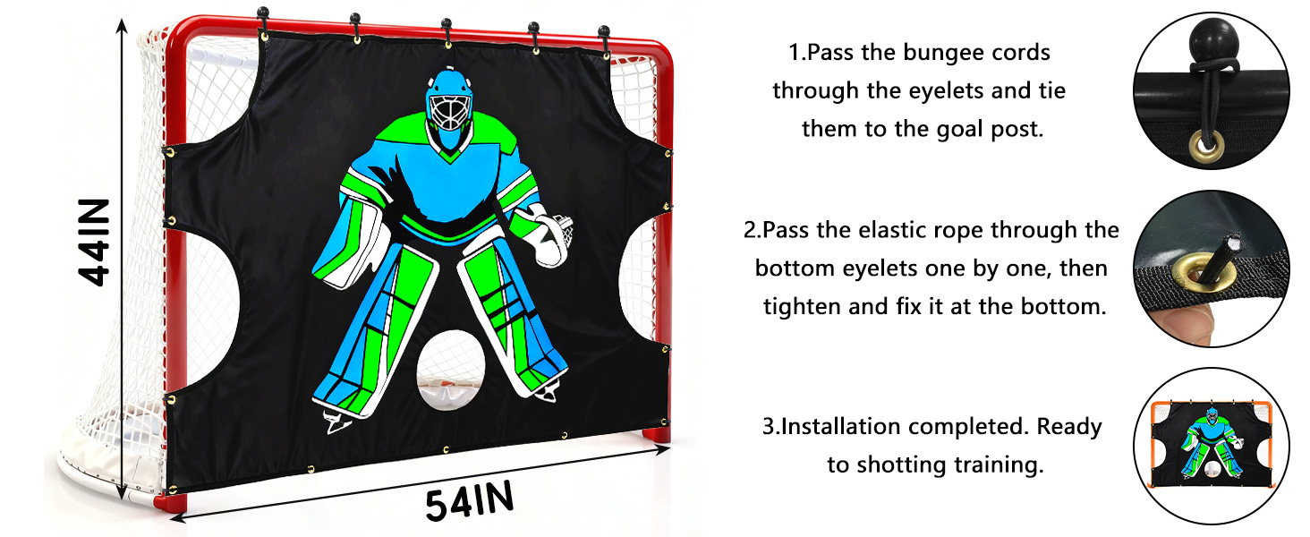 Transform your shooting accuracy with our professionally designed ice hockey target. This training tool is engineered to improve your shot control, precision, and scoring ability. Suitable for beginners building fundamentals or elite players refining technique, its robust construction delivers professional-grade results from every practice Quick Setup with Heavy-Duty Strapping The target features robust elastic bungee cords and an extended adjustable rope for quick, secure attachment to any standard hockey goal. The innovative fastening system keeps the sheet taut and stable, minimizing shake even during powerful slap shots. Focus entirely on your form without interruptions, making it ideal for backyard drills, team practices, or solo training sessions Precision Scoring Zones with Five Strategic Openings Master the art of finding the net's corners. Scientifically designed with five strategically placed cut-outs, this target guides you to systematically hone your aim for the goaltender's most vulnerable areas. This practice builds crucial muscle memory, translating directly into enhanced shot placement and goal-scoring confidence during fast-paced games Industrial-Grade PVC & Reinforced Stitching for Longevity Built to withstand relentless, high-velocity puck impacts, the target is constructed from high-density, industrial-grade PVC fabric. All critical stress points, especially around each opening, are fortified with multi-layer reinforced edging and professional stitching. This superior craftsmanship prevents tearing and deformation, ensuring the target maintains its shape and functionality All-Weather Durability for Indoor & Outdoor Train with confidence in any setting. Fully waterproof and UV-protected, this target stands up to rain, snow, and sun exposure. It delivers consistent, reliable performance whether you're on an indoor rink, in a garage, or practicing outdoors. Its resilience guarantees a long service life, making it a smart investment
