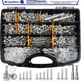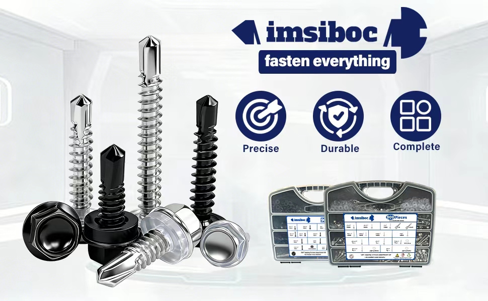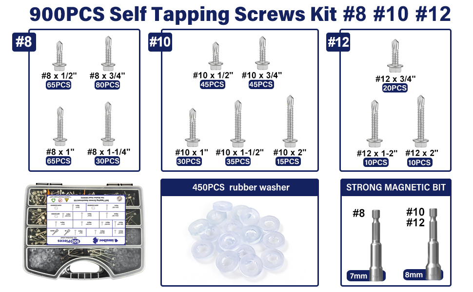 【PACKAGE INCLUDES】This 900-piece screws assortment kit includes 450 self-tapping screws for metal in 12 popular sizes: #8 x 1/2" (65pcs), #8 x 3/4" (80pcs), #8 x 1" (65pcs), #8 x 1-1/4" (30pcs), #10 x 1/2" (45pcs), #10 x 3/4" (45pcs), #10 x 1" (30pcs), #10 x 1-1/2" (35pcs), #10 x 2" (15pcs), #12 x 3/4" (20pcs), #12 x 1-1/2" (10pcs), #12 x 2" (10pcs), plus 450 rubber washers.