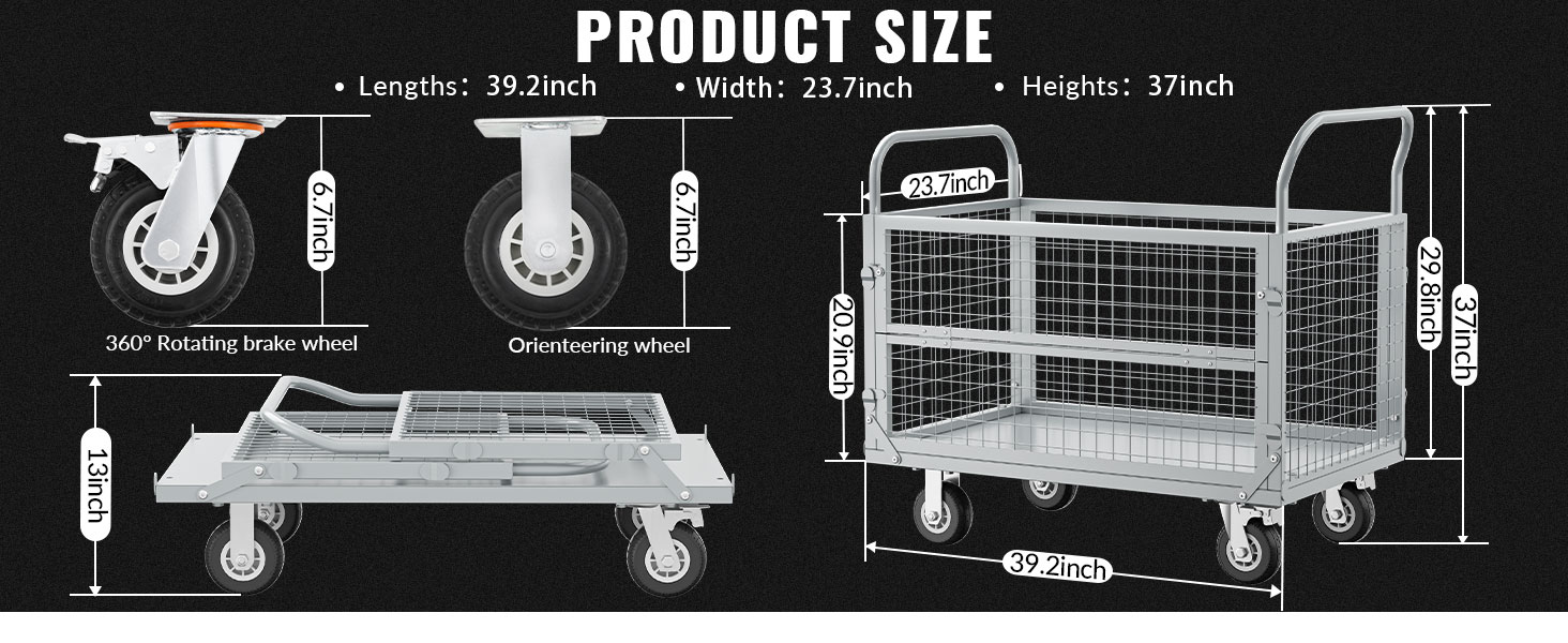 【Complete Accessories】- Our multifunctional carts are very easy to install and can be set up in 10 minutes.Each large platform truck kit includes 1 flat cart, 4 wheels, 4 fences, and matching screws and nuts.