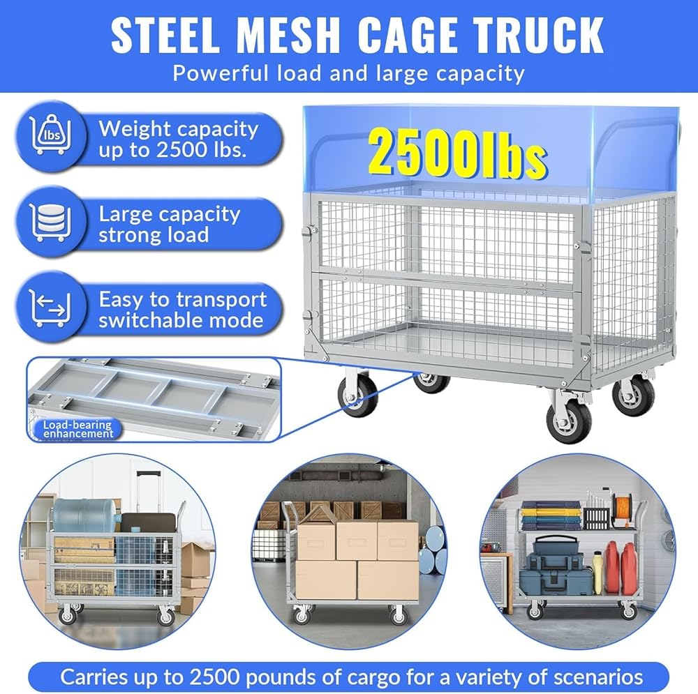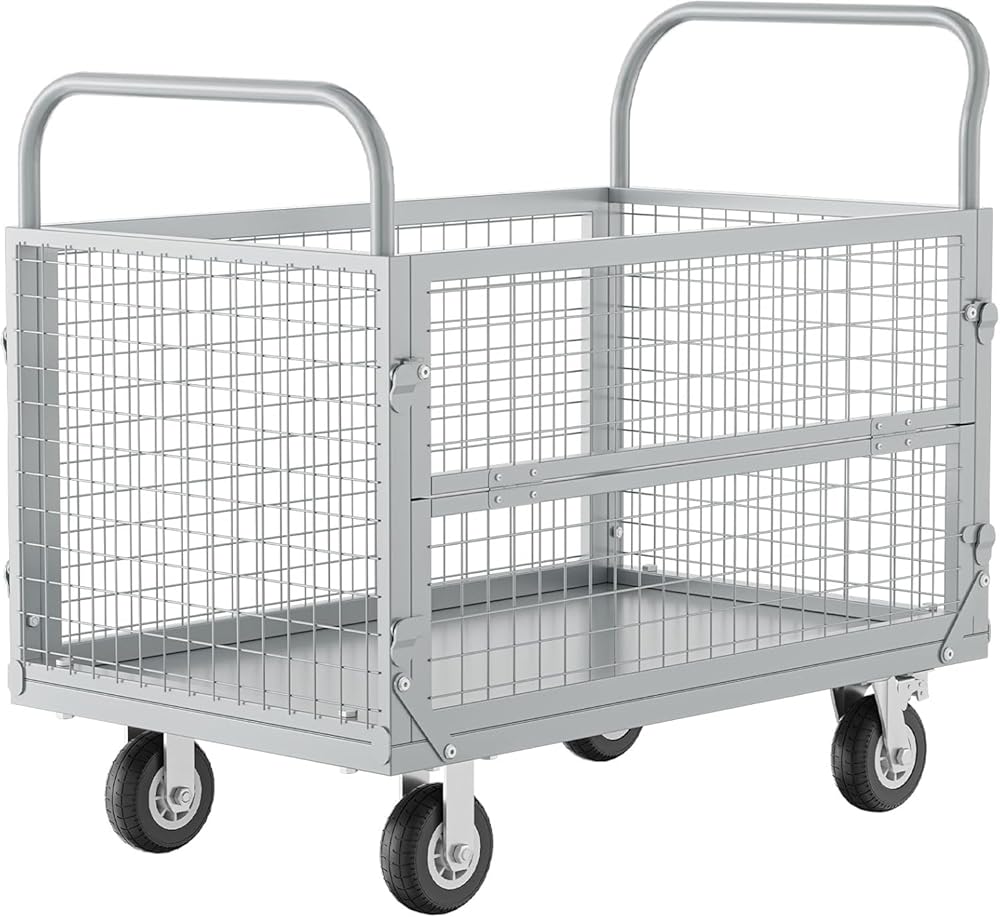Platform Truck with Cage, Heavy Duty Flatbed Cart, Foldable Hand Truck, Load 2500LB with 4 Swivel Casters, Multi-Functional Push Cart for Grocery, Laundry, Shelving, Pantry