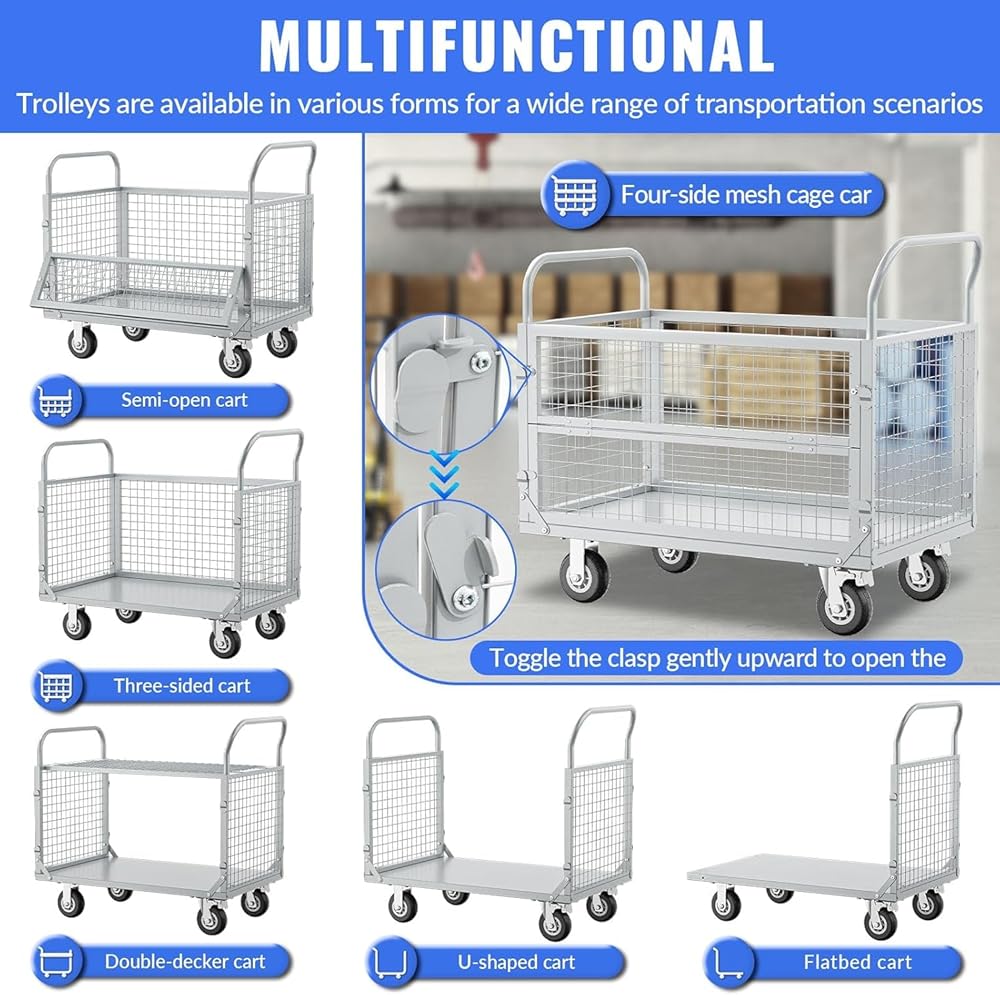 【5-IN-1 Versatility】- Our folding cage cart,designed to handle a variety of tasks with ease. With removable cages on both sides, This trolley can be effortlessly transformed into a flatbed cart, a U-shaped cart, a market stall trolley, a caged panel cart and a fence trolley.The sturdy metal cage ensures the safety of your goods during transportation while providing high visibility.