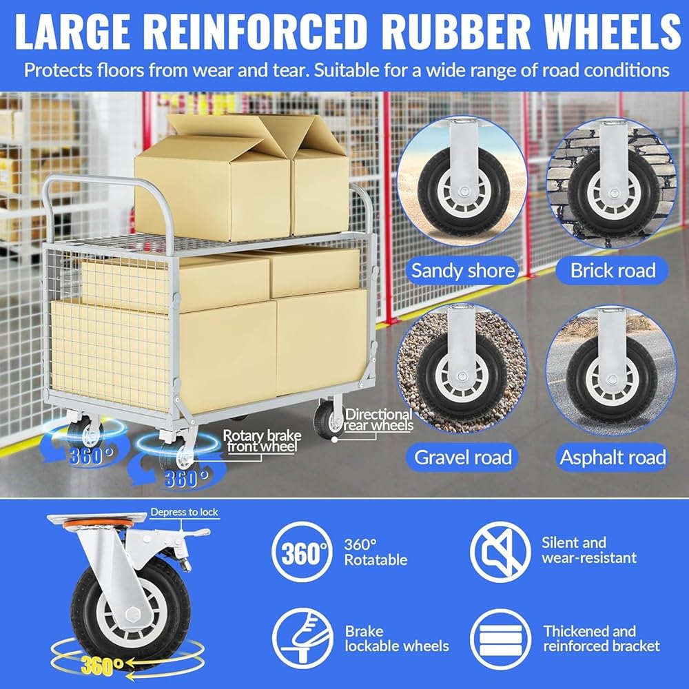 【Heavy-Duty Performance】- Built to handle the toughest jobs, our platform truck cart boasts a whopping 2500lb carrying capacity. Crafted from solid alloy steel material, the reinforced base provides extra support and stability. Every connection is expertly welded for maximum strength and durability.