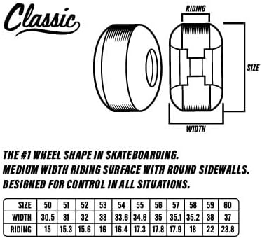 Classics Shape: The number 1 wheel in skateboarding. Medium width riding surface with round sidewalls. Designed for control in all situations.