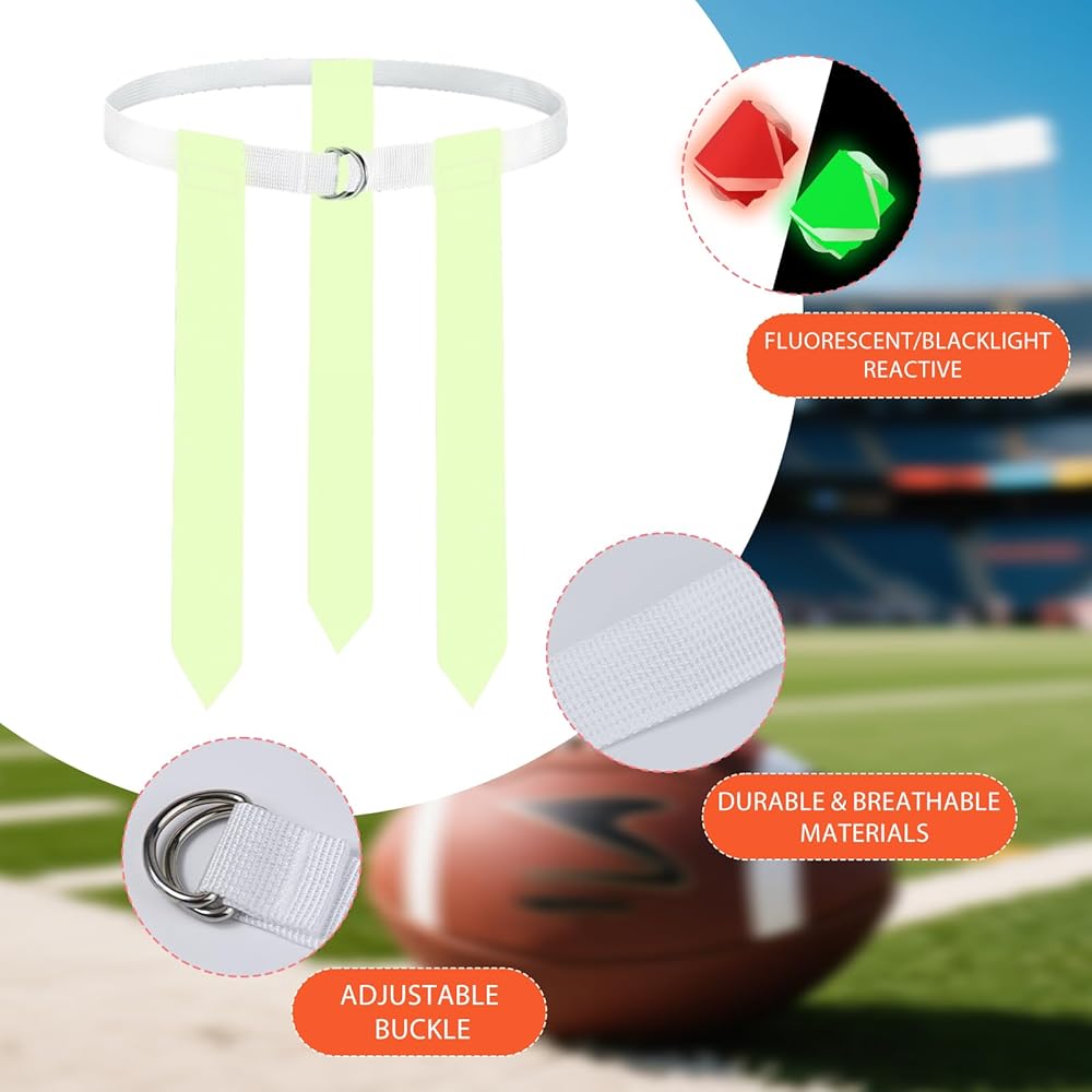 Glow in the Dark Flag Football Belts Set: 4 Adjustable Belts 12 Football Flags, Easy Tear-Away Design, Football Gear for Kid Youth Adult, Perfect for Camping Yard Beach Games, Glow Party Accessories