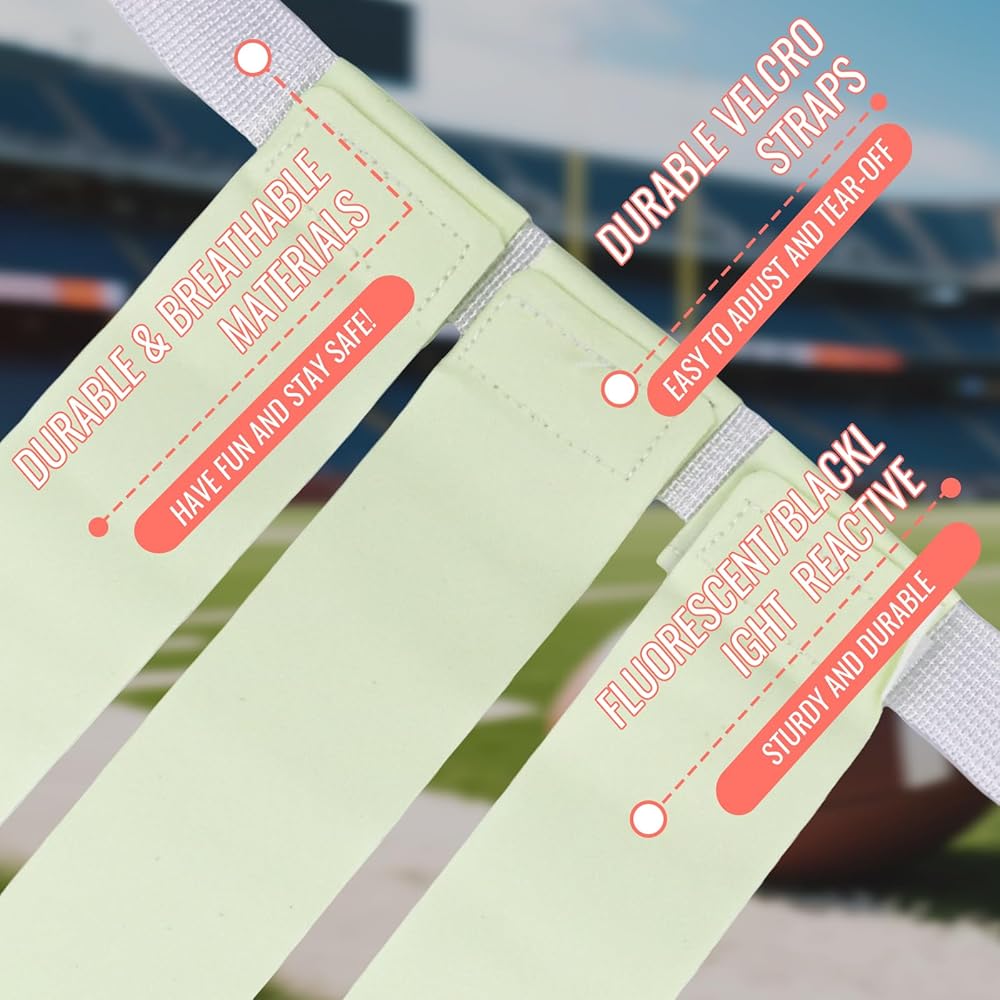🏈Ultra-Bright Visibility for Night Games: Enjoy flag football anytime, anywhere—even after dark. Designed with high-luminosity materials, our glow in the dark football flags ensure players can be seen clearly during low-light conditions. Whether you're playing for fun, safety, or in a competitive setting, this set is ideal for youth football gear, flag football training, night games, and glow in the dark party supplies.