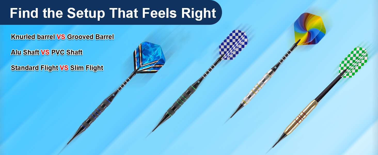 Customizable Dart Setup for Unique Throwing Style: This dart set includes 2 barrel textures, and 2 shaft options (aluminum & PVC), 2 flight styles (standard & slim); Built with the standard 2BA thread, all parts are replaceable for effortless assembly