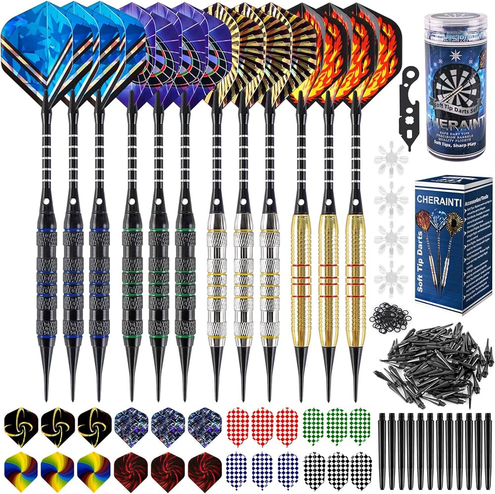 CHERAINTI Darts Plastic Tip Set, Professional Soft Tip Darts for Electronic Dart Board, 12 Pcs 18 Grams with 100 Extra Dart Tips, 12 Aluminum Shafts, 36 Flights, 50 Rubber O-Rings, and Storage Case