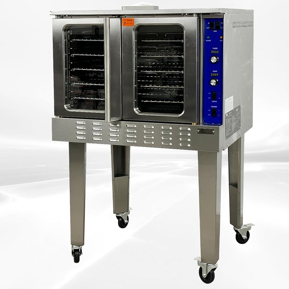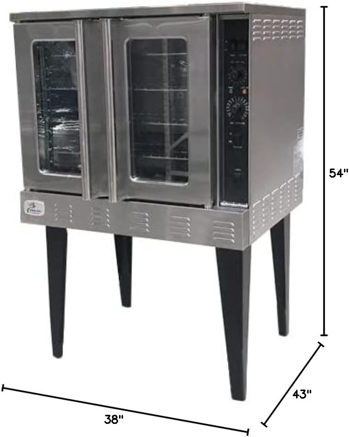 Commercial Convection Oven, Natural Gas, 54000 BTU, Single Deck, Four Legs, Restaurant Kitchen Bakery COG-1 【Features】This Electric Commercial Convection Oven could deliver 54000 BTU/hr, which could easily be used to warm, cook or bakery. 4 pieces of Chrome plated rack has 13 positions which brings great flexibility. The porcelain enamel coated interior makes is easy to clean and maintain. 【Heavy Duty】Our Range has a overall size of 38""W X 43""D X 54""H(with leg), two Door with glass window. Crafted with anti-corrosion stainless steel and welded frame structure, this convection oven is designed to last for years with ultimate protection and easiest maintainance. 【Details】The oven has a 60-minutes timer and temperature adjustment range from 150°C-500°C, controlled by the Dialing Knobs. The air circulation could effectively reduce cooking times (70%-80% ) while keep the quality of the food.It comes with 4 legs. 【Fuel】This Convection Oven can use either Natural gas or Propane, a 3/4"" NPT rear gas connection is included, automatic ignition system.