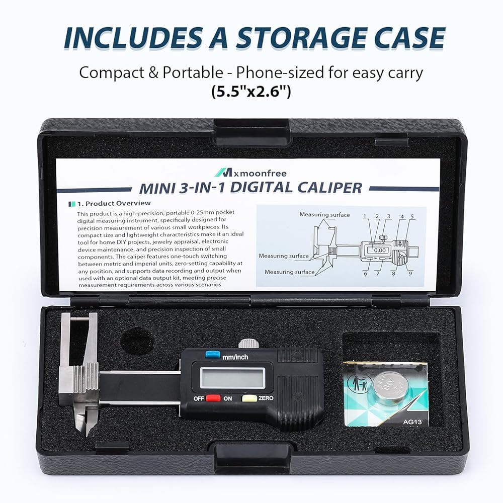 Mini Digital Caliper 3-in-1 Digital Caliper 0-25mm, Stainless Steel Precision Measurement Tool with LCD Display, Unit Conversion, Storage Case, Extra Battery