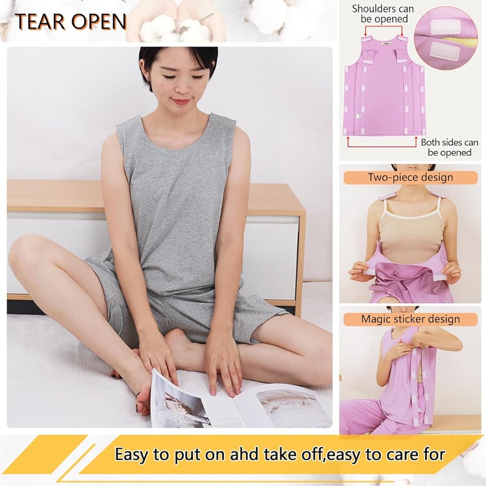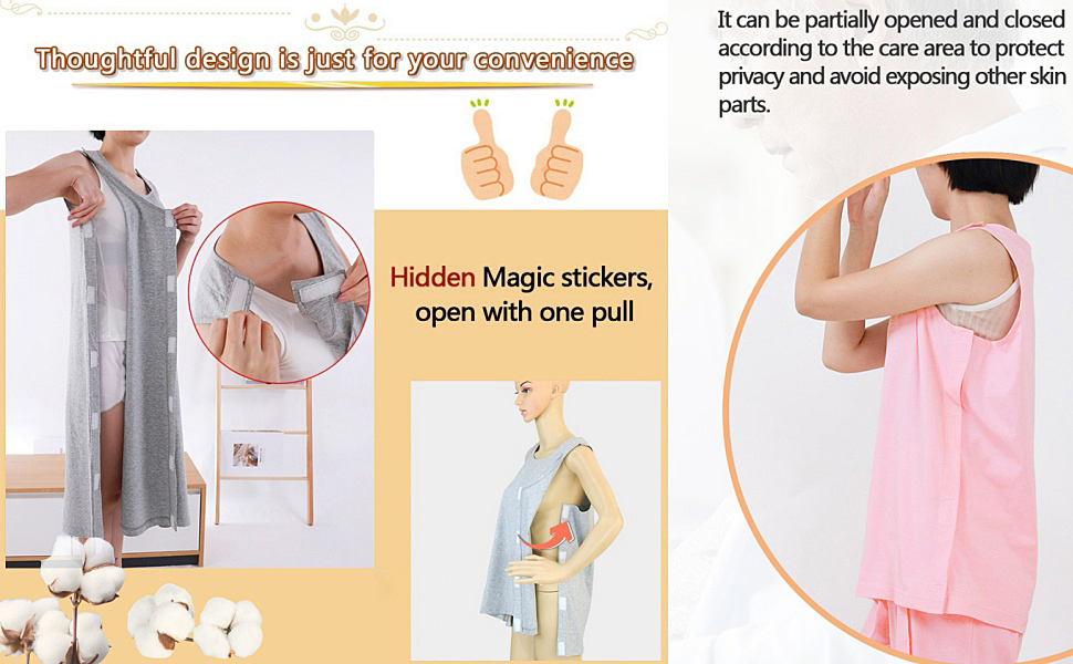 【Applicable Occasions】Suitable for bedridden patients, postoperative care and rehabilitation, paralysis bedridden, acupuncture treatment, dialysis chemotherapy, shoulder surgery recovery, arm fractures, inspection and scrubbing, breast surgery, heart bypass surgery, physical therapy, the elderly, etc. For anyone with limited mobility, this is a must-have piece of clothing and a very suitable gift for postoperative patients.