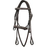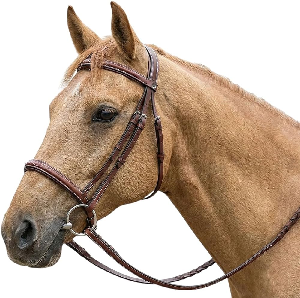 The Henri de Rivel Pro Fancy Raised Comfort Crown Padded Bridle With Fancy Raised Reins is a great choice for sensitive horses. The padded comfort crown allows for equal pressure across the poll. Classic, fancy white stitching across the brow and nose bands create a traditional design. Complete with stainless steel hardware and laced reins, this bridle is ready to use and will last for years of riding. Dimensions: 1" nose and brow bands, 1/2" cheek pieces, 5/8" reins. *Bit shown in image not included*