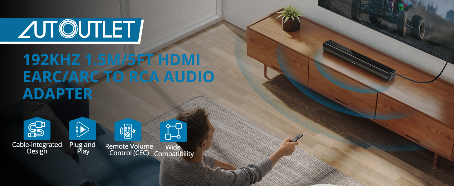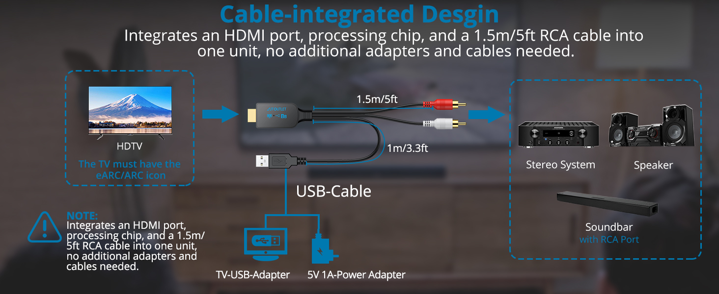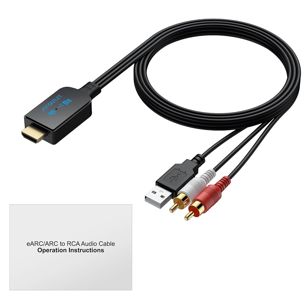 【Integrated Cable Design】This eARC/ARC to RCA audio cable combines HDMI ports, a processing chip, and a 1.5m/5ft RCA cable in one sleek design. No need for extra adapters or cables.