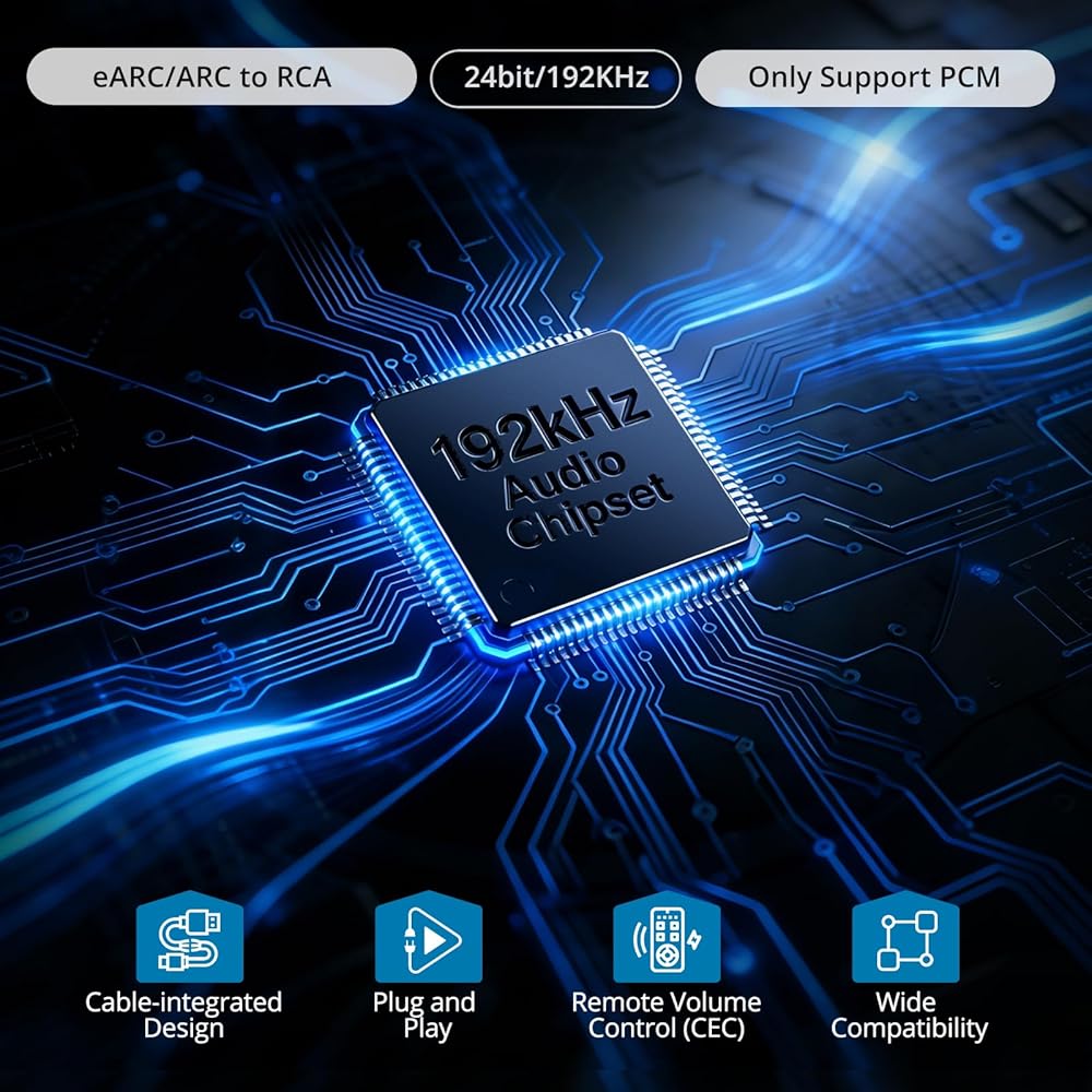 【Stereo PCM Audio Only】This eARC audio extractor delivers high-quality stereo sound with up to 192kHz sample rate. It does not support Dolby, DTS, or any multi-channel surround sound formats. Ensure your TV's audio output is set to “PCM” or “LPCM” for optimal performance