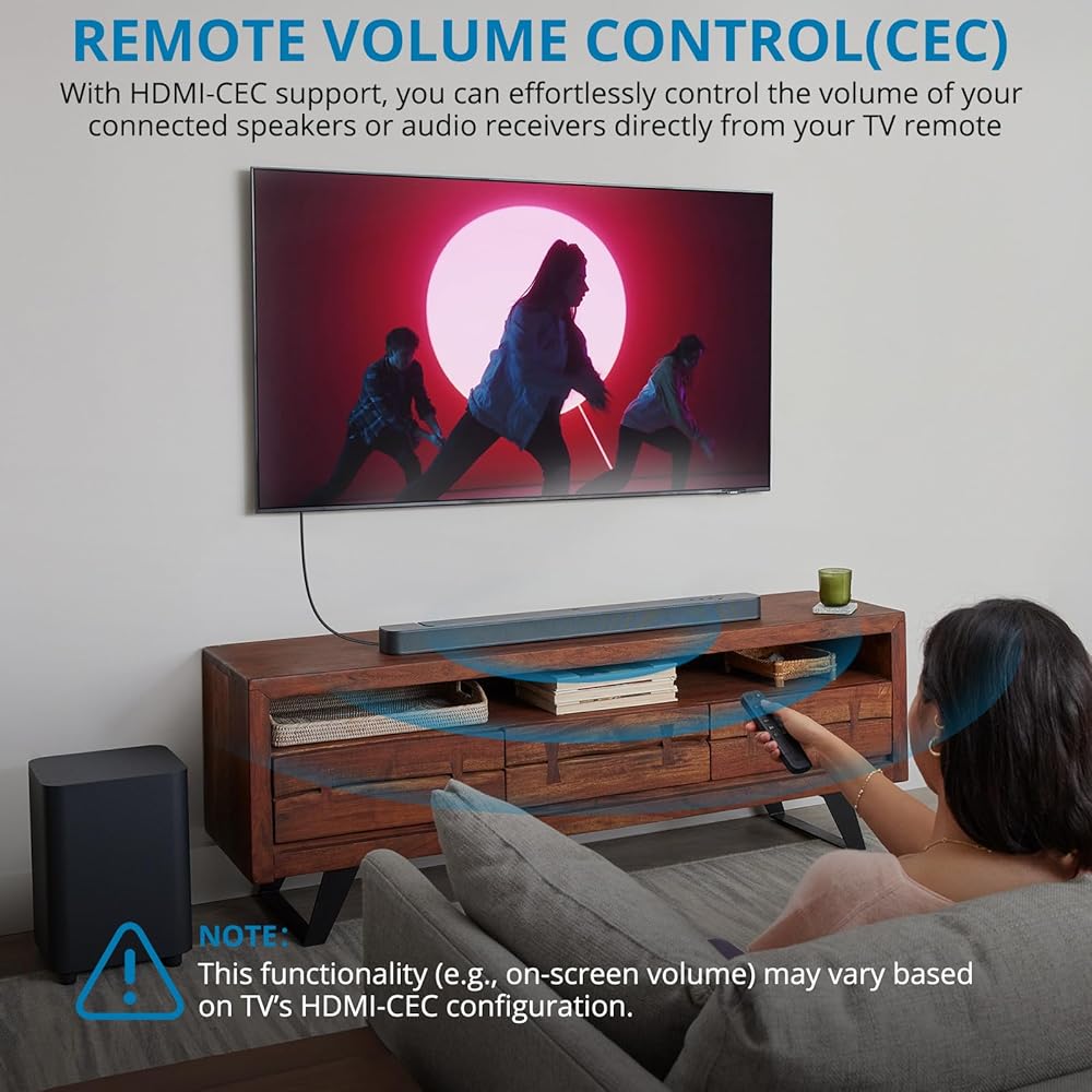 【TV Remote Volume Control (CEC)】Enjoy the convenience of TV remote volume control through HDMI-CEC support. Adjust the volume of your connected soundbar or amplifier directly from your TV remote without needing multiple remotes. Please note that certain TVs may require you to enable CEC functionality and set it according to specific protocol settings