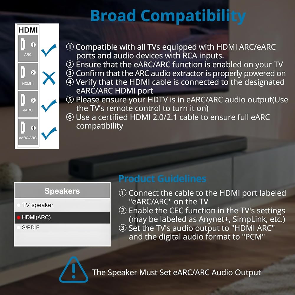 【Wide Compatibility&Product Guidence】This hdmi arc to rca audio converter is compatible with any TV equipped with an HDMI ARC/eARC port and audio devices with RCA inputs, such as speakers, soundbars, and amplifiers. Follow the simple 3-step setup: ① Connect the cable to the TV's eARC/ARC HDMI port; ② Enable CEC on your TV; ③ Set the audio output to “HDMI ARC” and the audio format to PCM