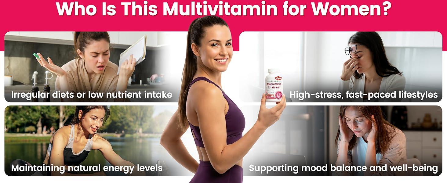 Daily Wellness for Active Women: This women's multivitamin is designed for women aged 18+, providing complete daily nutrition for those facing high stress, irregular diets, or frequent travel, helping maintain balance, vitality, and overall wellness every day