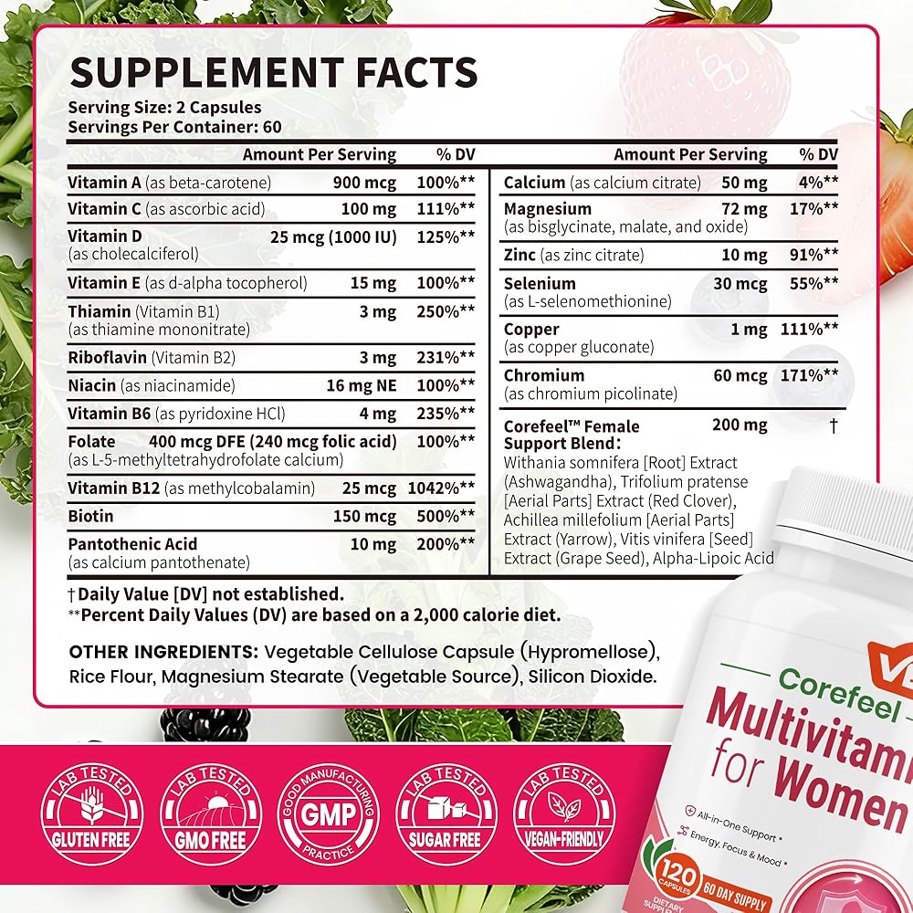 Exclusive Female Wellness Blend: Features Corefeel with Ashwagandha, Red Clover, and Alpha-Lipoic Acid, a thoughtfully formulated womens vitamins that help maintain natural balance, energy, and daily vitality