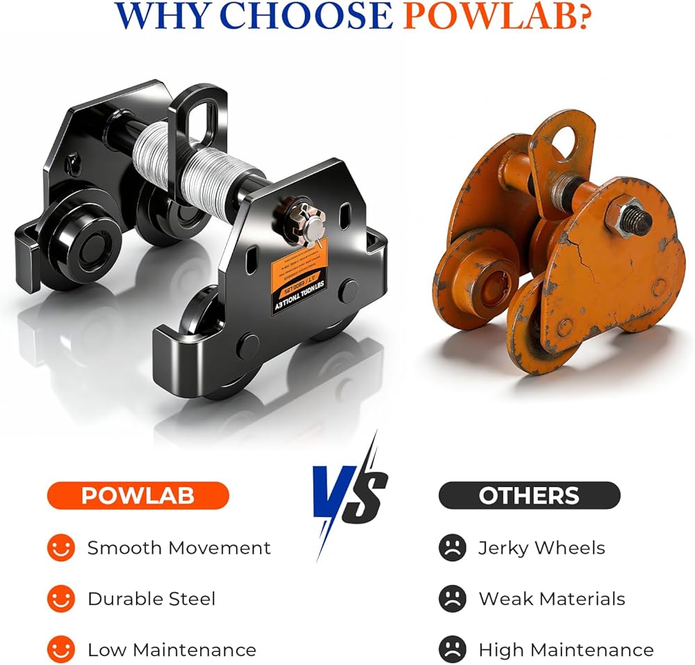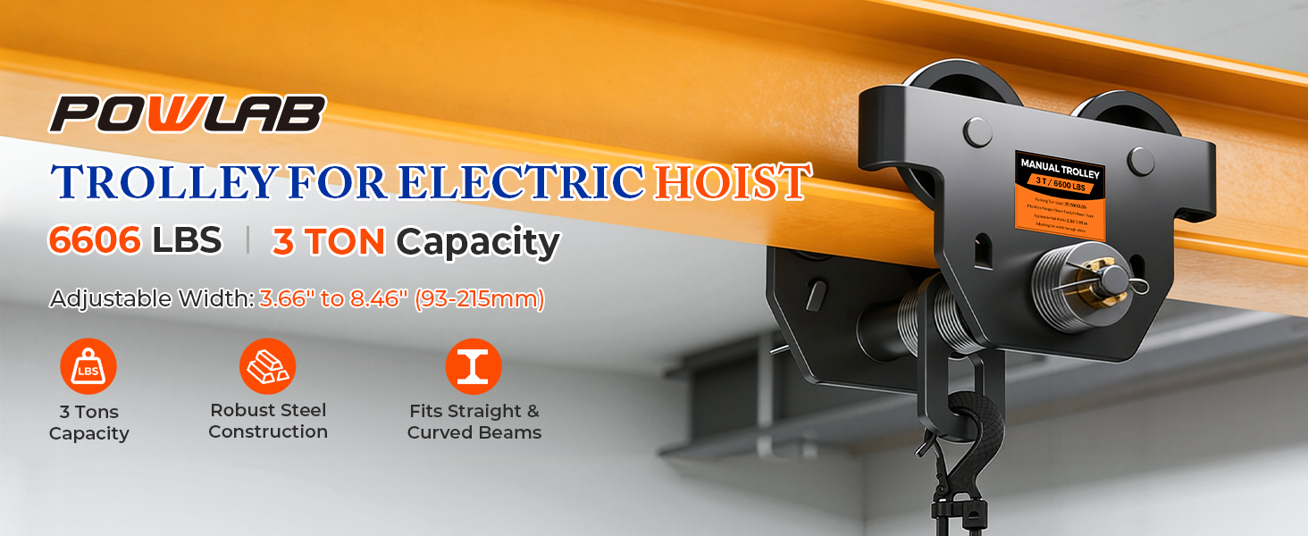 Adjustable Flange Width: POWLAB hoist trolley designed to fit both I-beams and H-beams, this manual trolley accommodates flange widths from 3.66" to 8.46" (93-215mm). The included washers ensure a precise fit, making it adaptable to a wide variety of steel beams for maximum compatibility.
