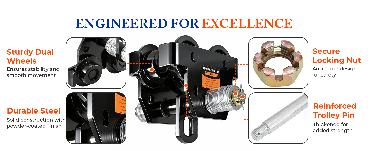 Quick and Easy Installation: Experience hassle-free setup with the i beam trolley hoist, featuring straightforward installation. Simply measure, adjust with washers, and secure using nuts and wire pins. Suitable for both straight and curved beam tracks, it offers flexibility and ease of use across different applications.