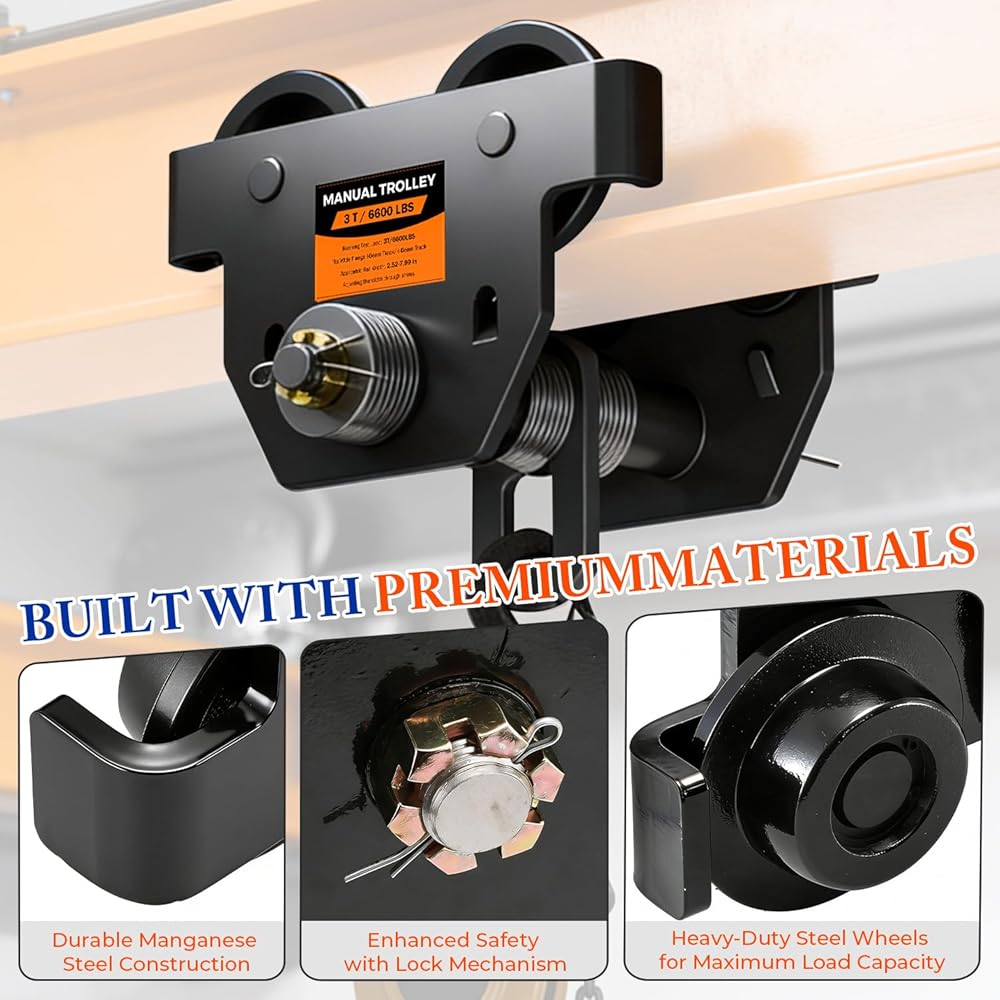 Superior Heavy Duty Construction:I beam trolley crafted from high-quality manganese steel, this trolley boasts a robust load-bearing capacity of up to 6614 lbs (3 tons). Its corrosion-resistant design ensures long-lasting durability, making it perfect for rigorous industrial environments.