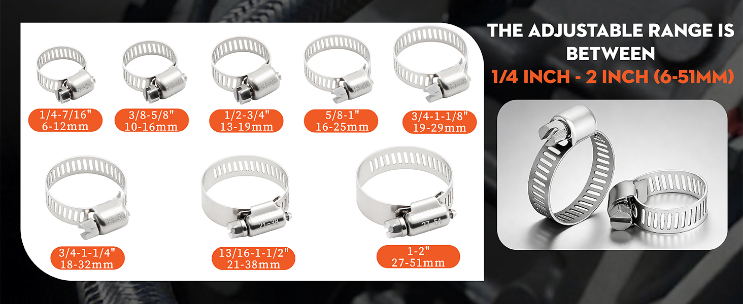 Wide Application: Suitable for automotive, industrial, marine, home, and garden use. Ideal for securing fuel lines, gas pipes, radiator hoses, water pipes, and more, both indoors and outdoors.