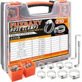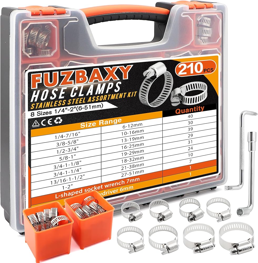 COMPREHENSIVE KIT: 175-piece stainless steel worm gear hose clamp assortment ranging from 1/4 inch to 2 inch (6-51mm) for various applications,including 45pcs of 6-12mm, 35pcs of 10-16mm, 31pcs of 13-19mm, 20pcs of 16-25mm, 15pcs of 19-29mm, 8pcs of 18-32mm, 15pcs of 21-38mm, and 6pcs of 27-51mm, with a socket wrench and a screwdriver included.