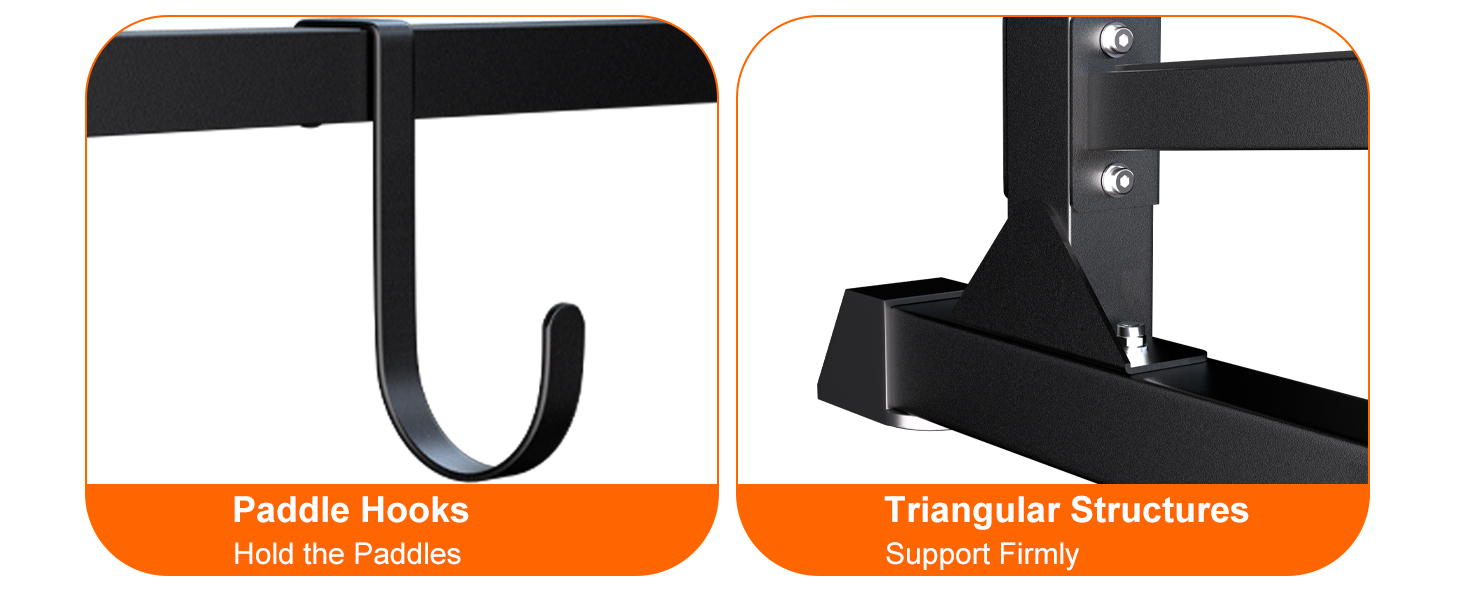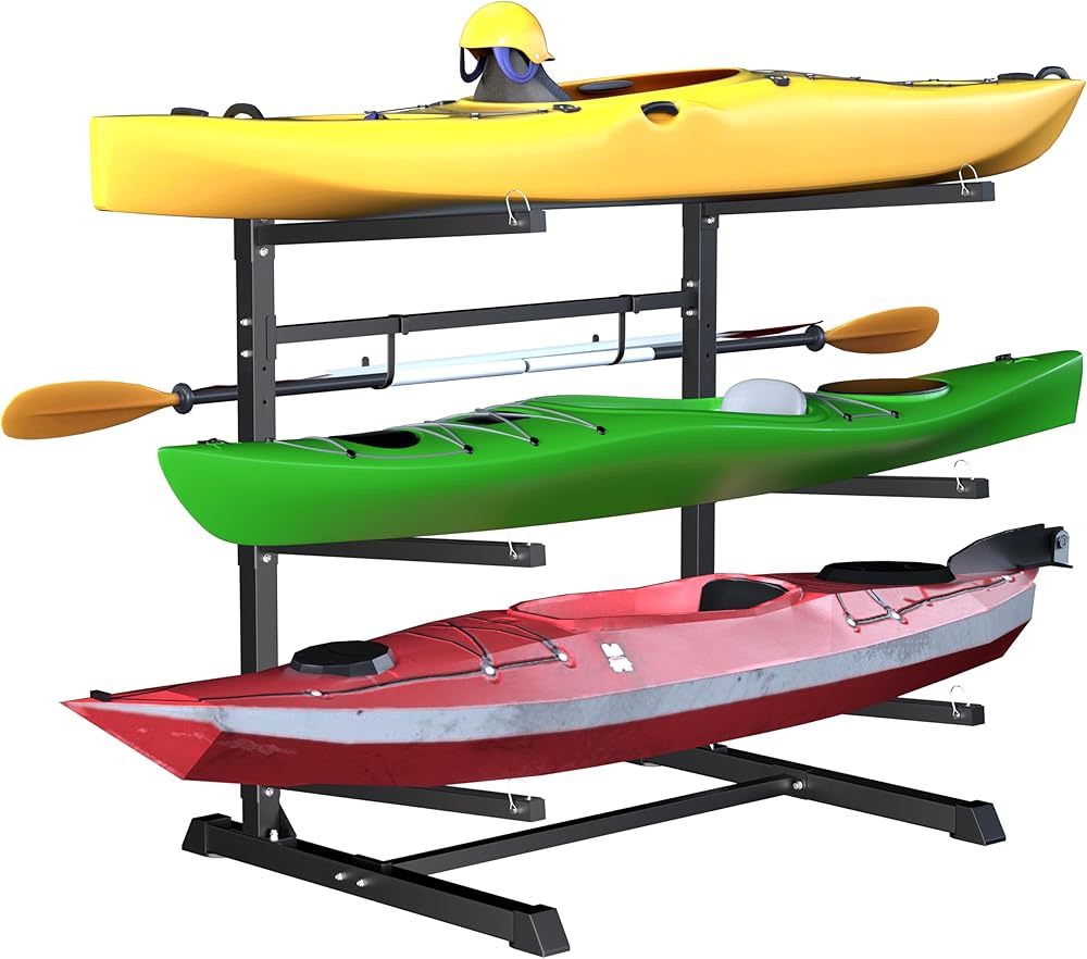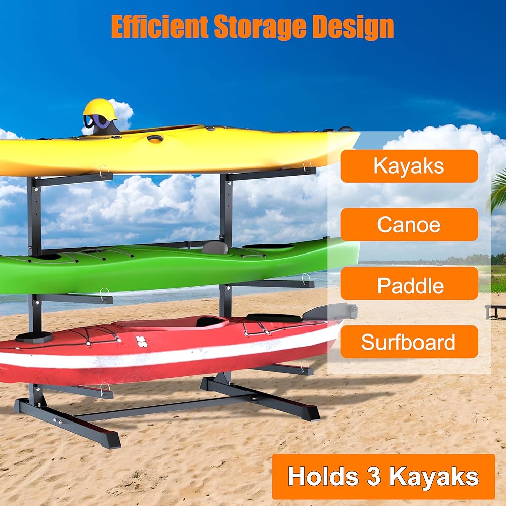 VERSATILE STORAGE SOLUTION: Our kayak stand features 3 cradles, plus a paire of paddle board hook.This sturdy frame kayak rack helps you store up to your kayaks, canoes, stand-up paddleboards and surfboards in your garage, backyards, dock, decks any indoor or outdoor area.