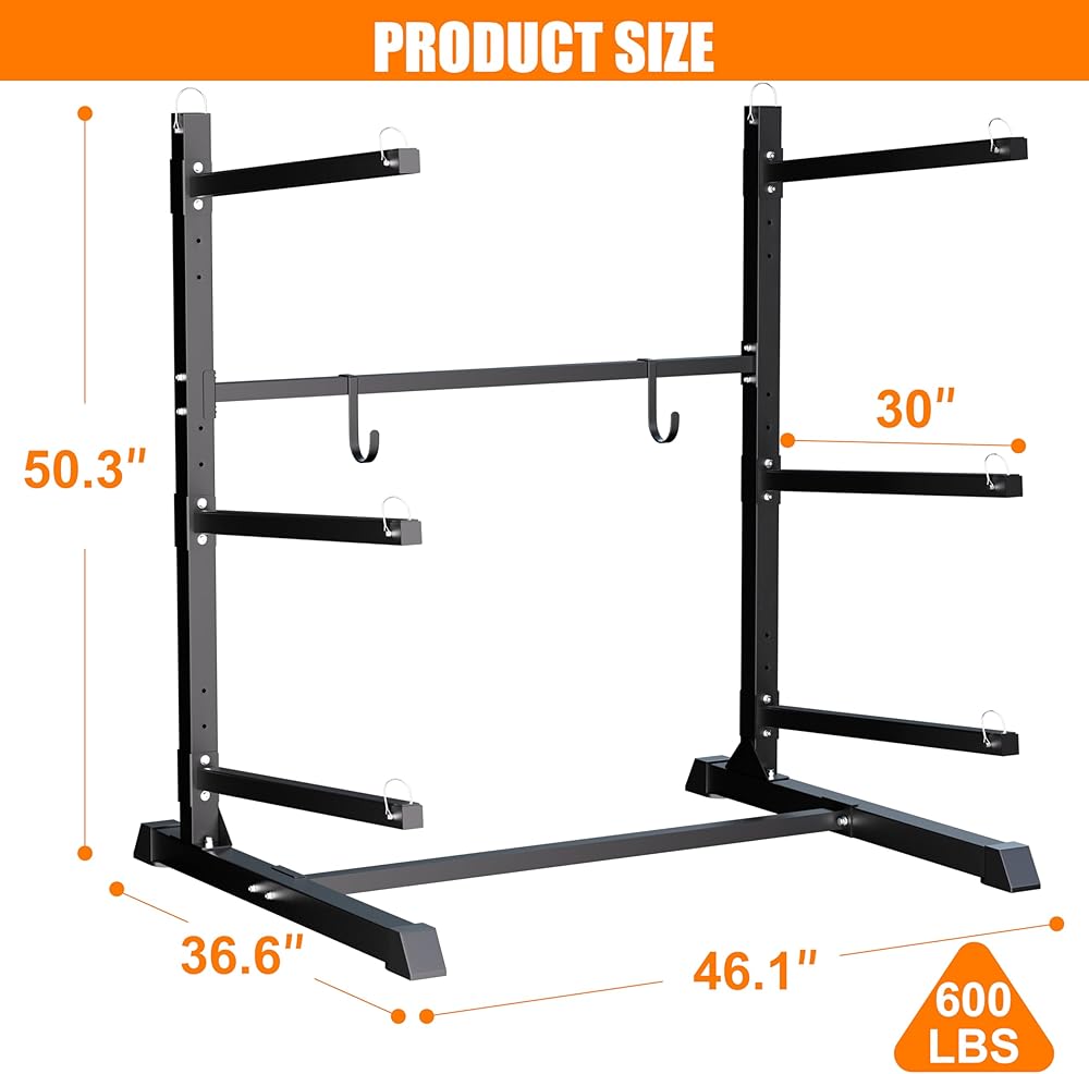 FREESTANDING DESIGN: With total dimension of 46.1"W x 36.6"D x 50.3"H, each of the cradles features 3-position height adjustment, so you can easily customize the kayak storage spacing to fit different sizes. Plus, the cradles are removable, letting you reconfigure the space you need.