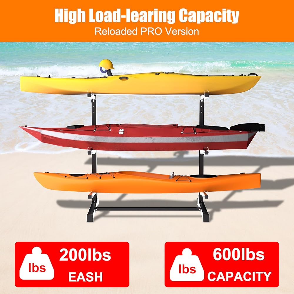 DURABLE CONSTRUCTION: Constructed of industrial-grade steel with a rust-proof powder coating, this canoe rack can hold up to 200 lbs per tier, with a total load capacity of 600 pounds. Each cradle features rubber pads to prevent scratches and abrasions.