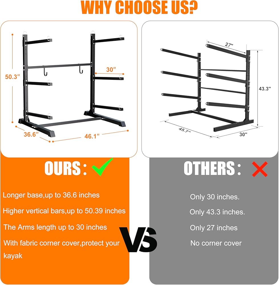 PROTECT YOUR EQUIPMENT: Our outdoor kayak storage rack is deeper and taller than standard kayak stands, providing significantly better hull support and preventing slippage. This enhanced fit keeps your gear stable and secure. Each cradle end features a D-ring tie-down point, making it easy to strap down your kayak with straps or ropes.