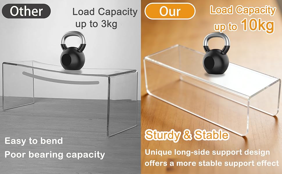 Sturdy and Stable: Our unique long-edge support design delivers superior stability compared to common short-edge designs found in the market. Load Capacity: up to 10 kg. Reinforced acrylic material and balanced weight distribution ensure secure display of various decorative items without wobbling.