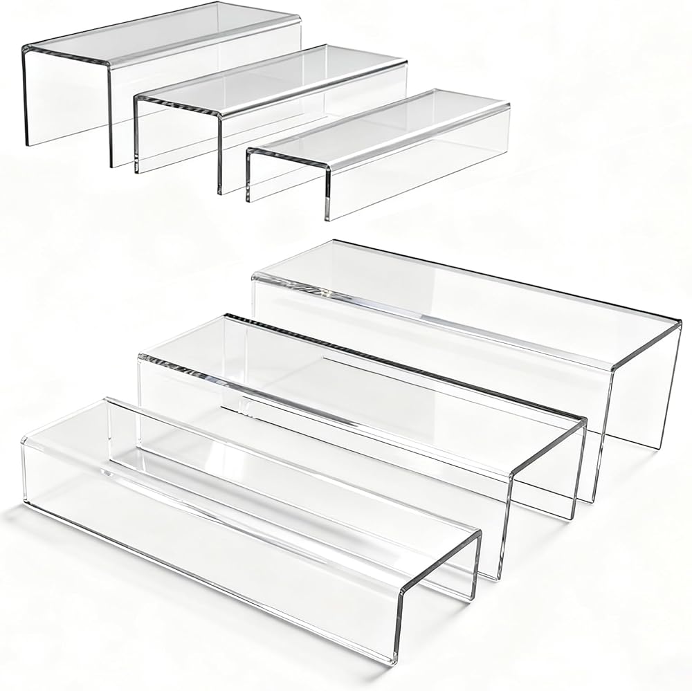 Multi-Size Set: Includes 2 sets, 3 size sets for choice (L: 8.66"x3.54"x3.15", M: 8.66"x3.15"x2.36", S: 8.66"x2.75"x1.57") to fit Toy Figures, jewelry, cupcakes, and more. Great for tiered displays or single-layer use
