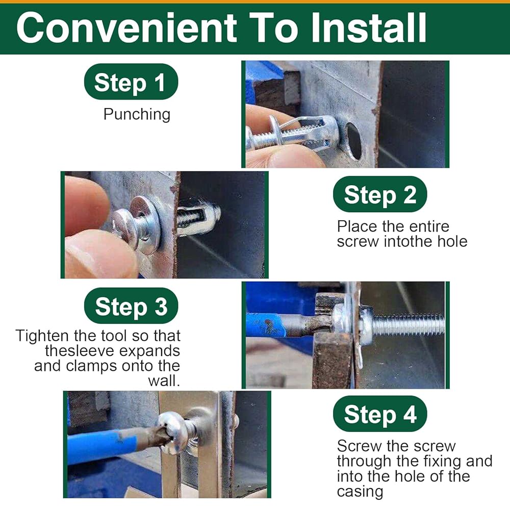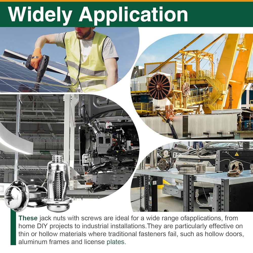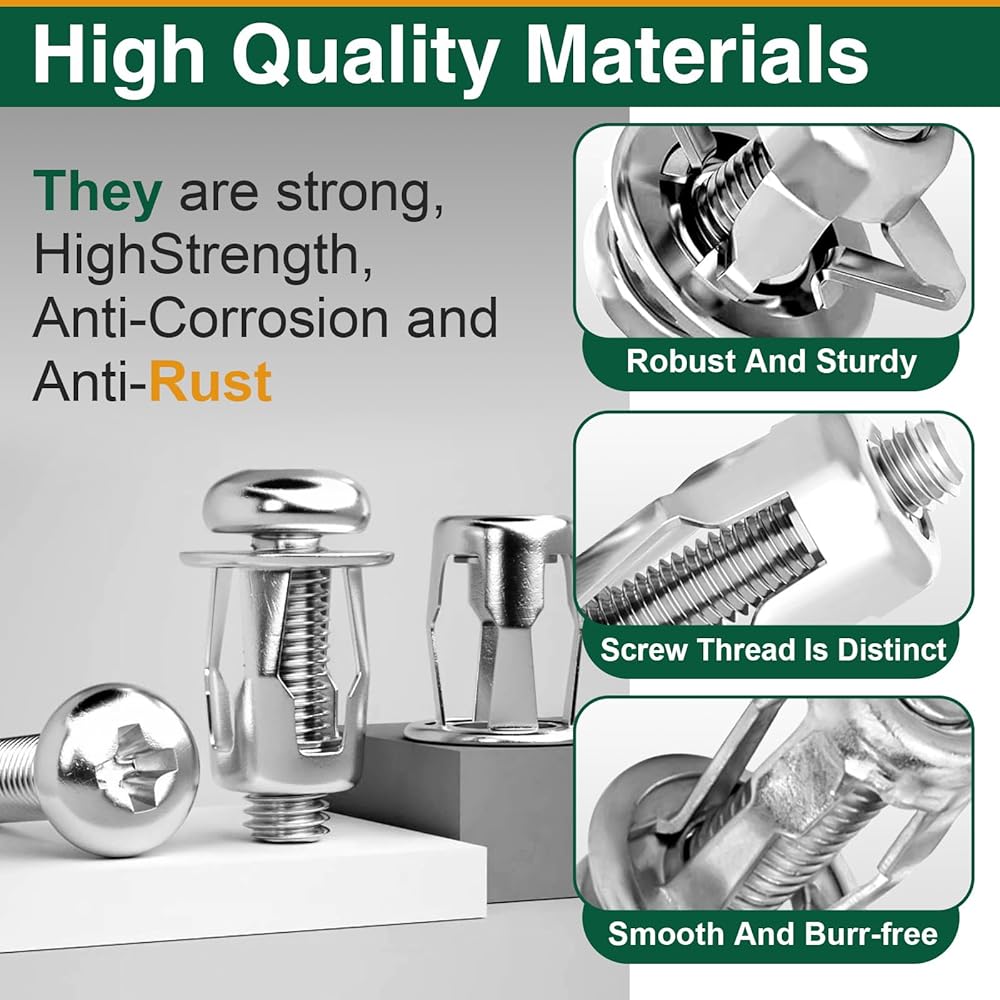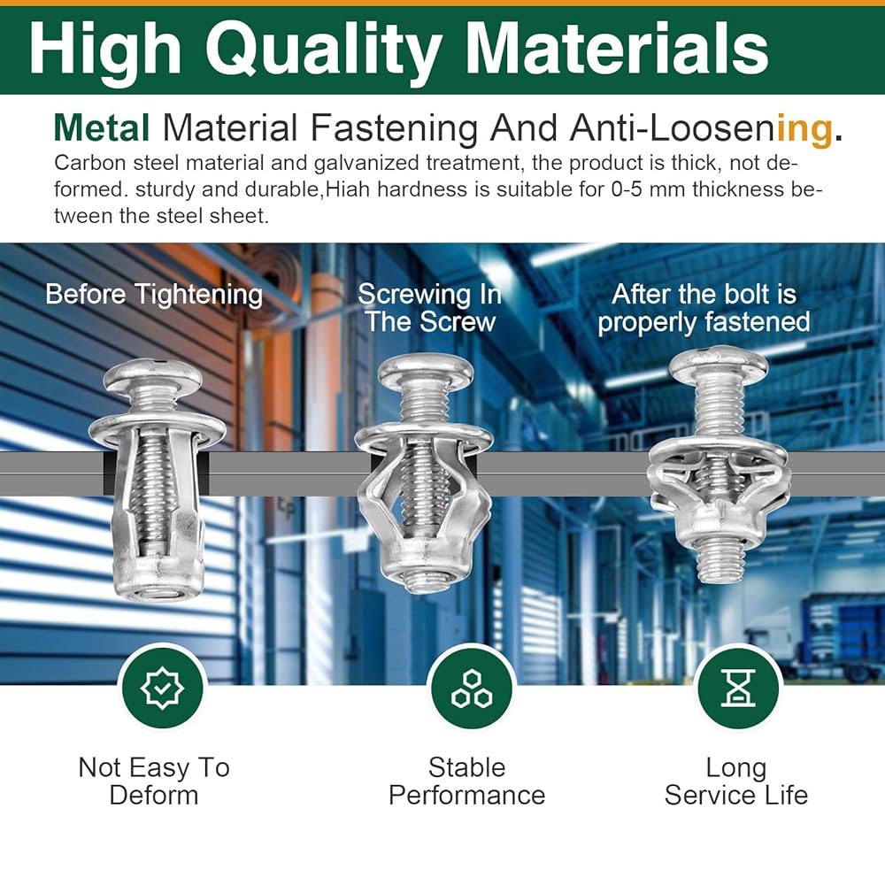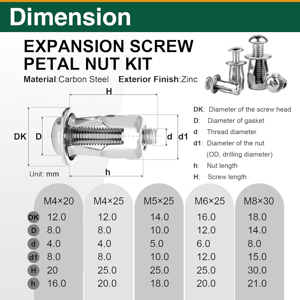 EASY TO INSTALL: Suitable for drywall and metal materials with diameters ranging from 8 to 15 millimeters: M4 is suitable for 8mm diameter, M5 is suitable for 10mm diameter, M6 is suitable for 12mm diameter, M8 is suitable for 15mm diameter. These nuts feature a unique petal design that provides enhanced grip and tightening force during installation, minimizing slippage. In addition, the petal shape effectively distributes clamping forces and protects fastening components from damage