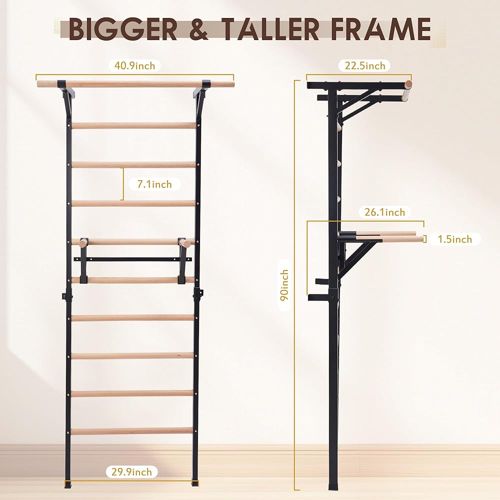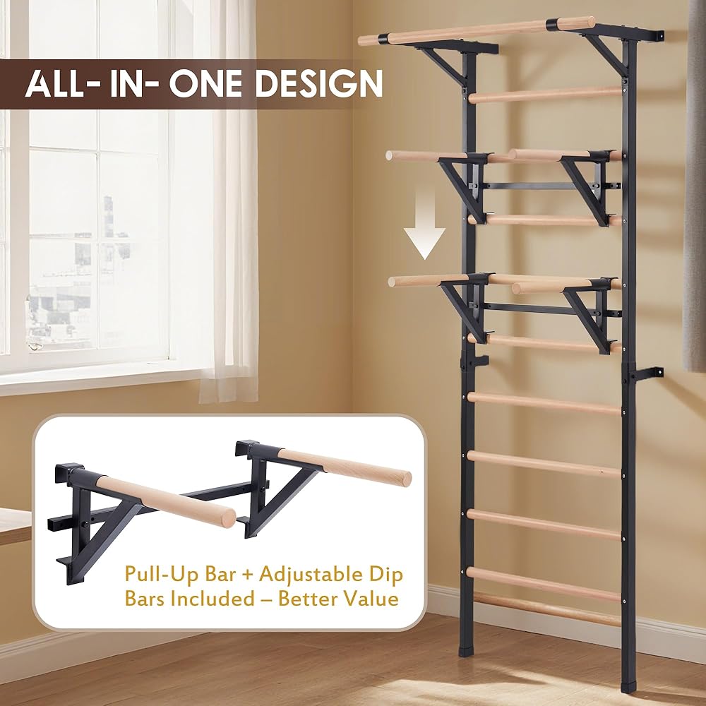 Heavy-Duty Stability for Home Gyms – Built on a sturdy steel frame combined with robust beechwood, this ladder withstands rigorous fitness routines—ideal for stretches, gymnastics, pull-ups, and physical therapy without compromising integrity. 220 lbs Capacity.